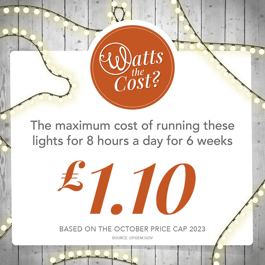 We’ve called this new feature ‘Watt’s the Cost?’ (not apologising for the pun) and it is determined from the output wattage of our lights, the new price cap of 27p per Kilowatt/hour and assuming you have the Christmas lights on for eight hours a day over six weeks (mid November - December).