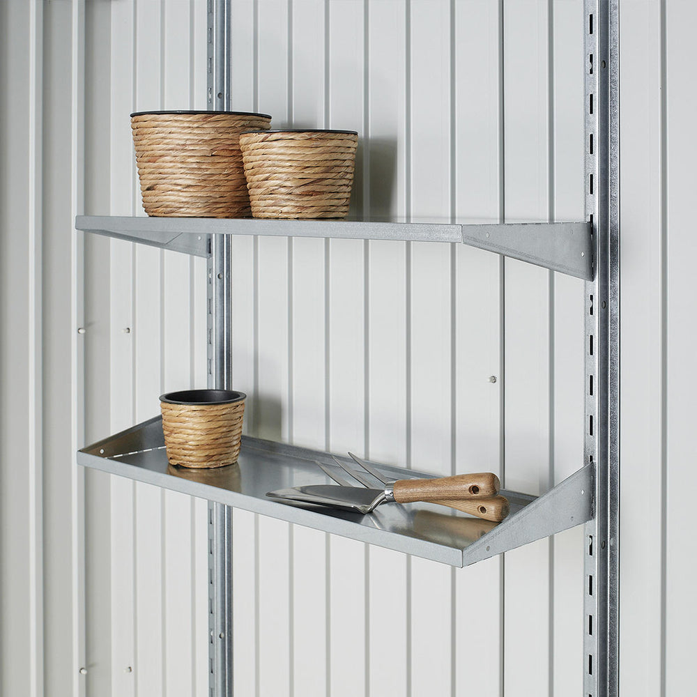2 x Galvanised shelves (24.5cm depth x 72cm wide) with two support rails, max. load 15kgs.