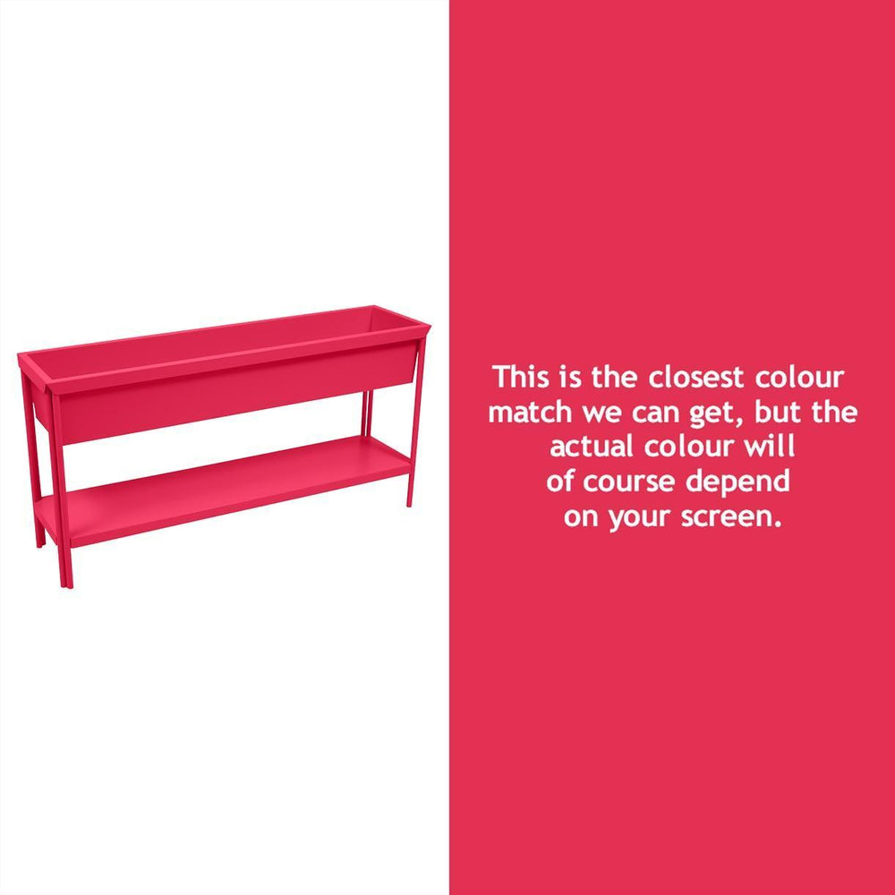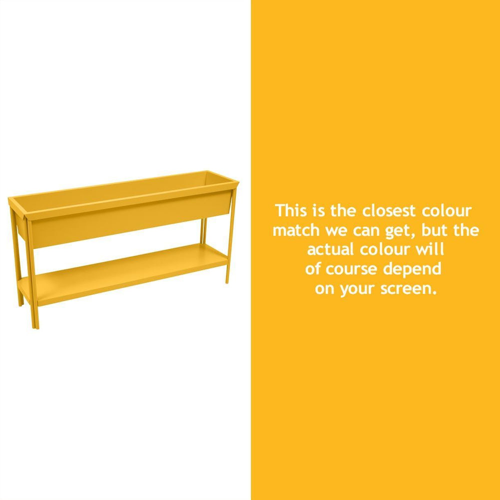 The planter has a tubular steel frame base and sheet steel tray. The tray has a drainage hole with an offset drainage system. The planter box is removable from the stand.