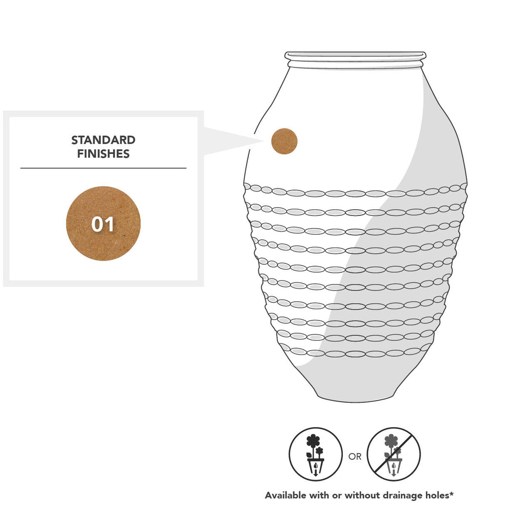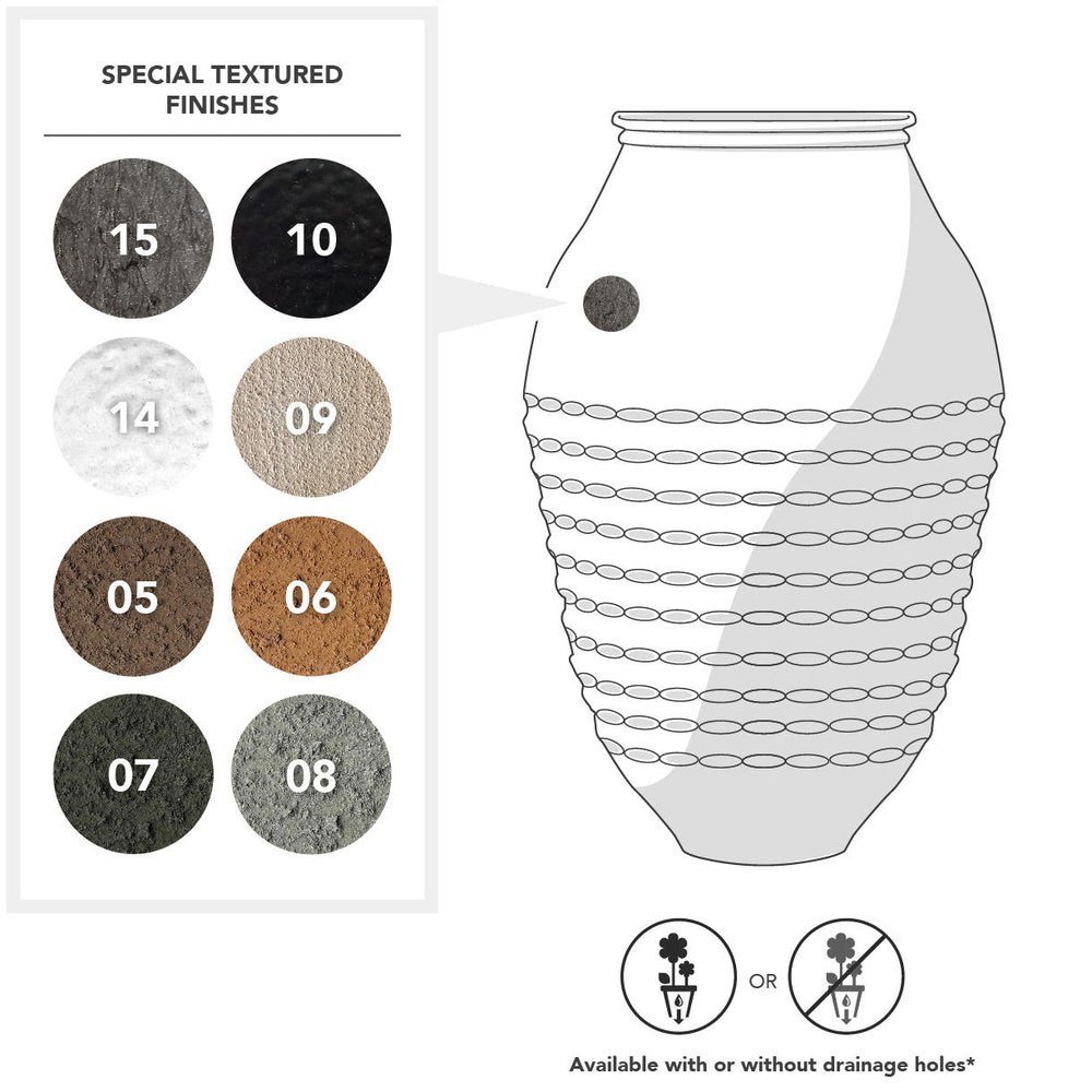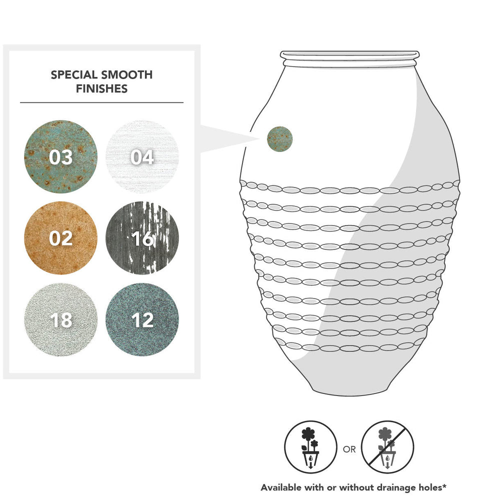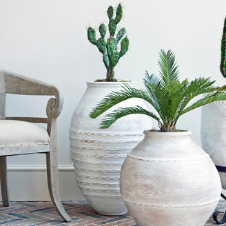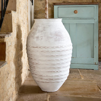 These planters are influenced by the large olive jars found in Mediterranean countries and now used as grand planters or garden art. Finished to look authentic and original, these ones are made in fibreglass. They are ideal to be used in colder climates, as there is no risk of frost damage unlike vintage originals.