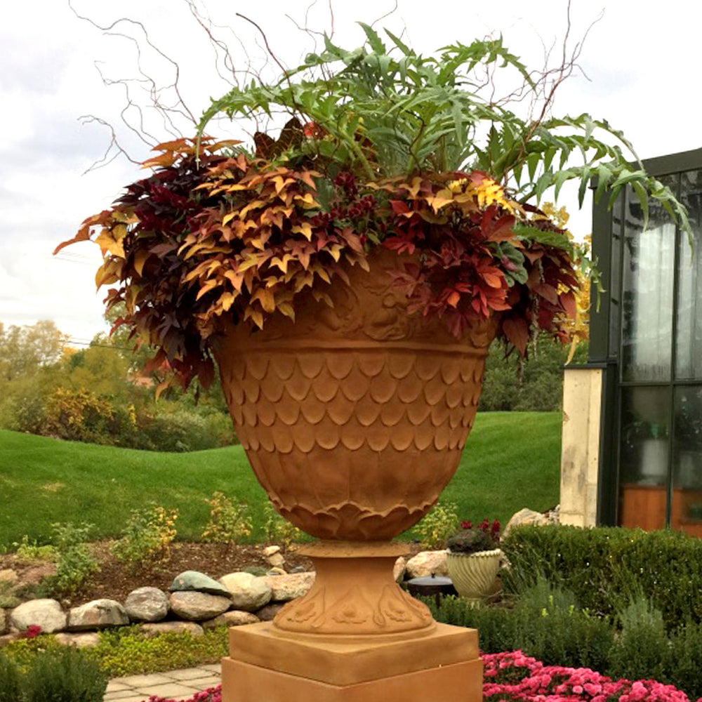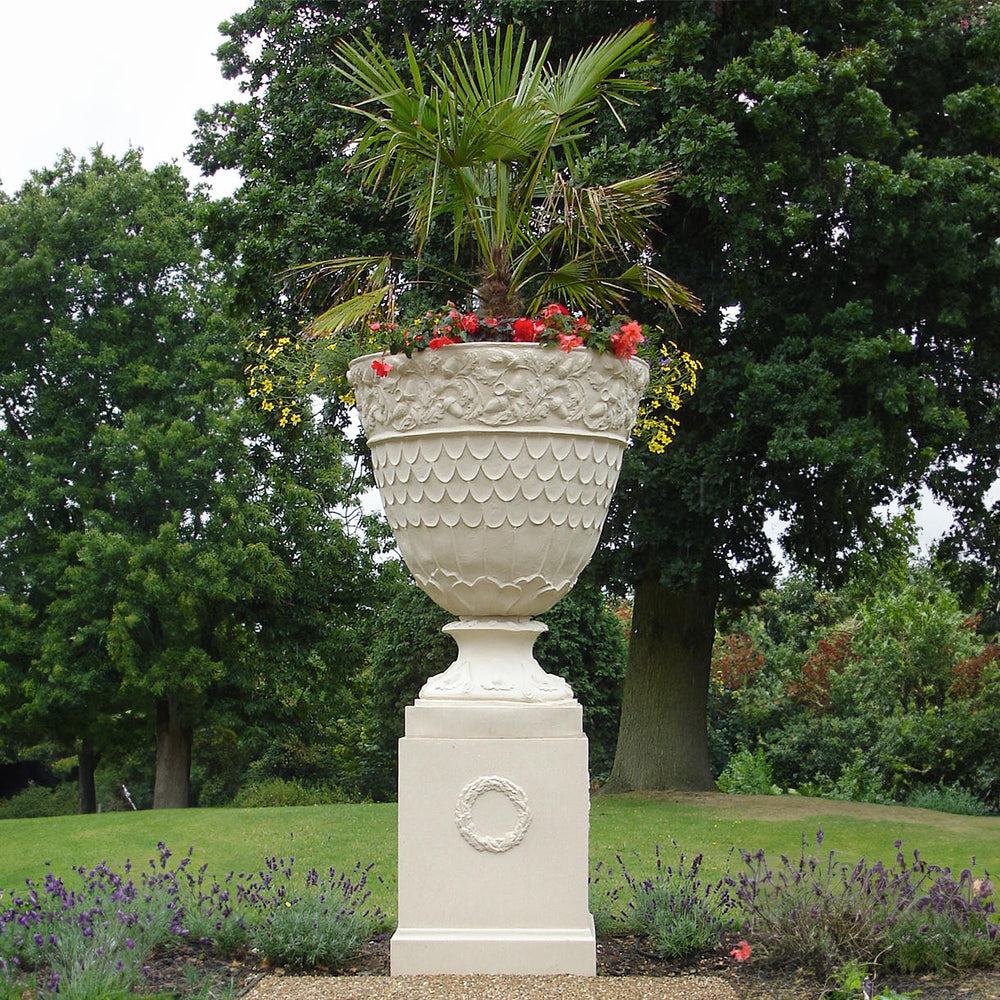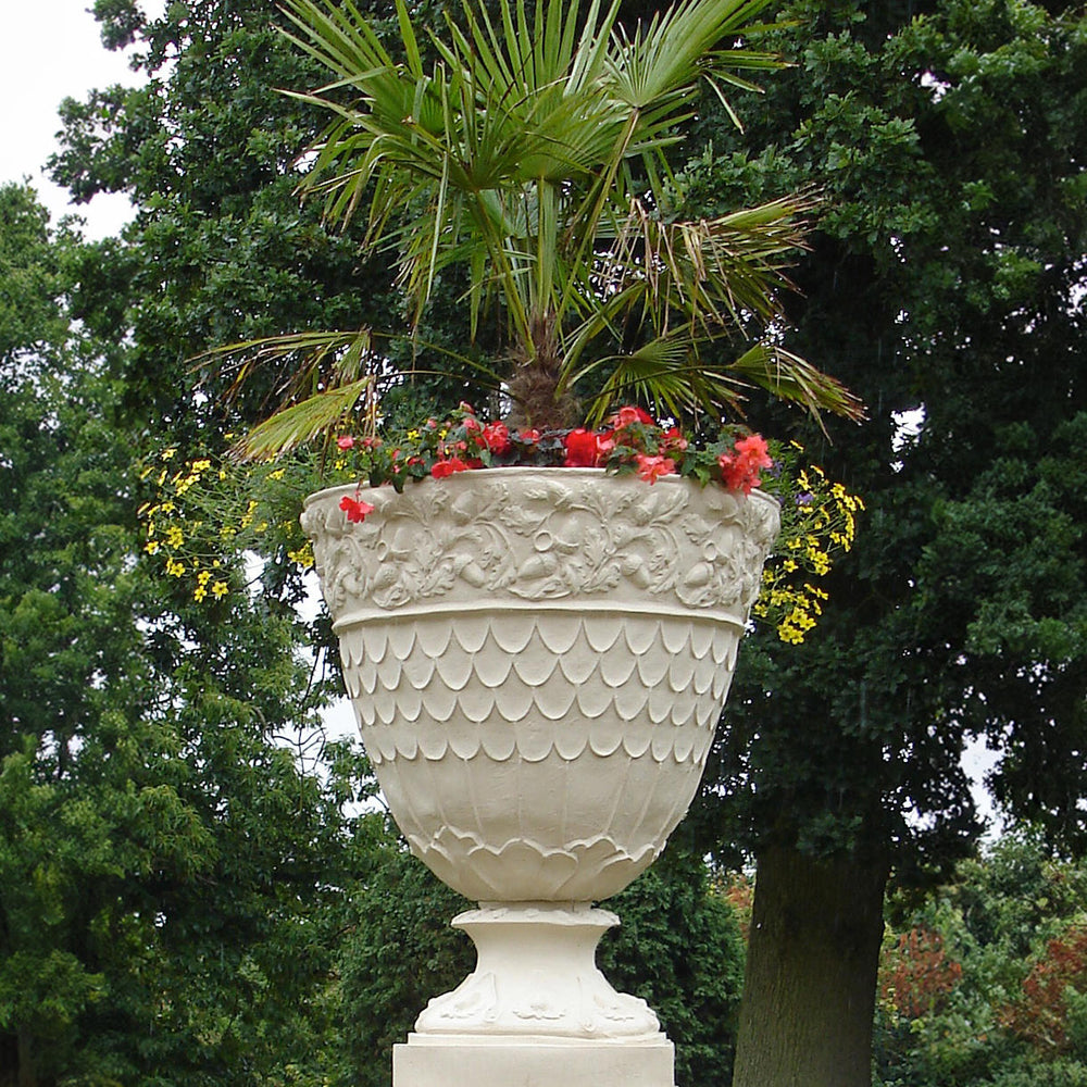 Elegant Baroque vase planter in the style often found in traditional country house gardens. With attractive oak leaf detailing, this grand vase will make a striking focal point when placed on a pedestal.