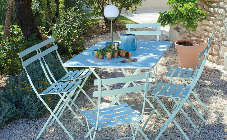The Bistro 117 x 77cm Table can seat up to 6 with the Bistro Metal Chairs. This set comes in the refreshing Ice Mint colour along with the Mooon! Outdoor Table Lamp in Cactus to provide ambience. This set is ideal for those wanting to entertain larger parties, and will still fold away for easy storage. You can alter the colour for this set to any combination from the 22 colour palette.