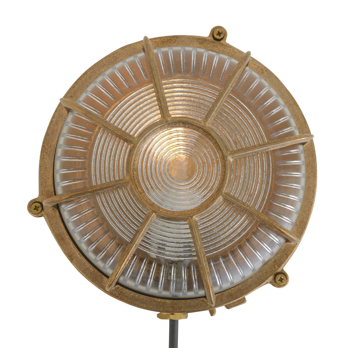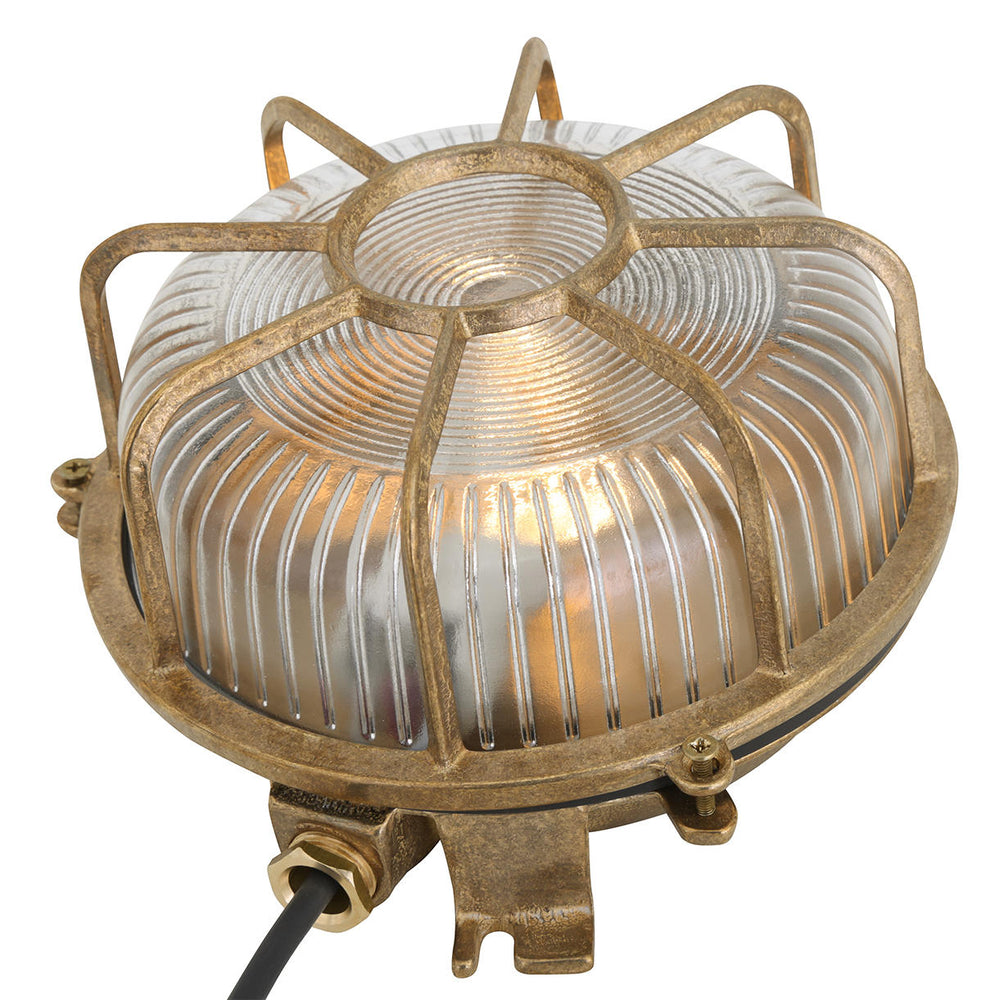 Crafted from solid brass, it features a thick prismatic shade that spreads light evenly, while an eight-spoke brass cage secures the shade and adds subtle industrial character.