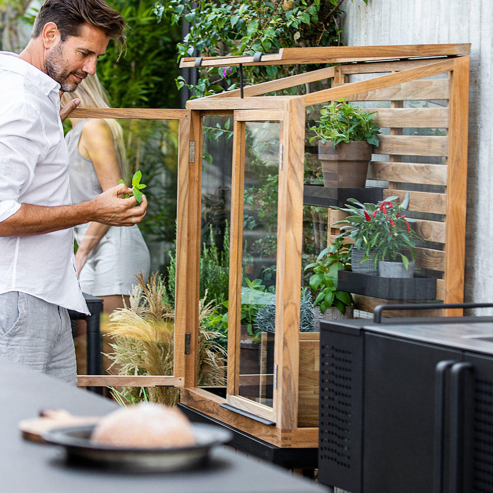 The greenhouse is made with a frame in warm teak with glass panes and two doors, so you can easily organise your favourite herbs and vegetables.
