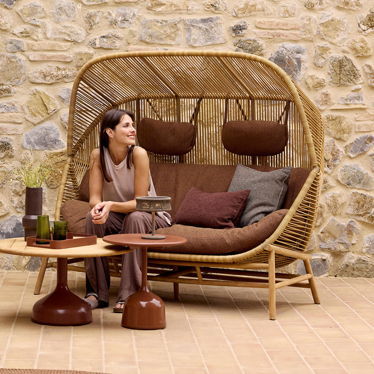 With a structural and transparent design, Hive will give a light and airy appearance to your outdoor space and doesn't take up too much space. The sofa can be purchased with or without the seat and back cushions.
