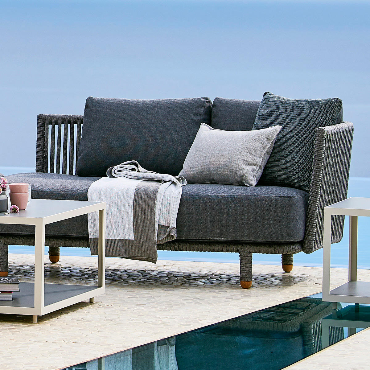 The Moments modular furniture can be accompanied by the Level occasional tables and the Infinity round outdoor rugs.