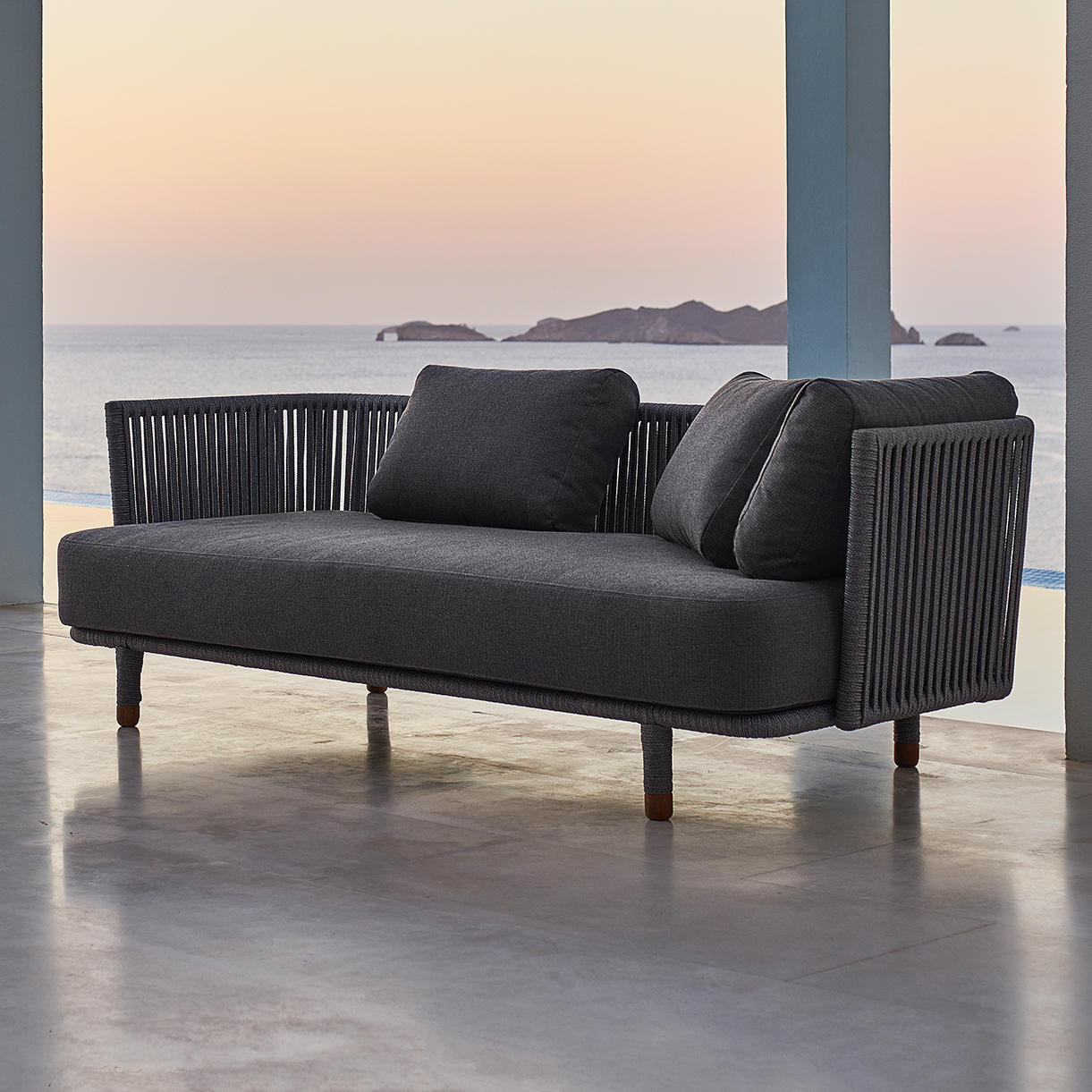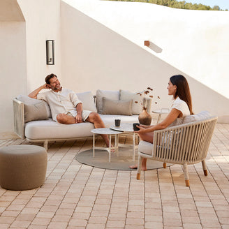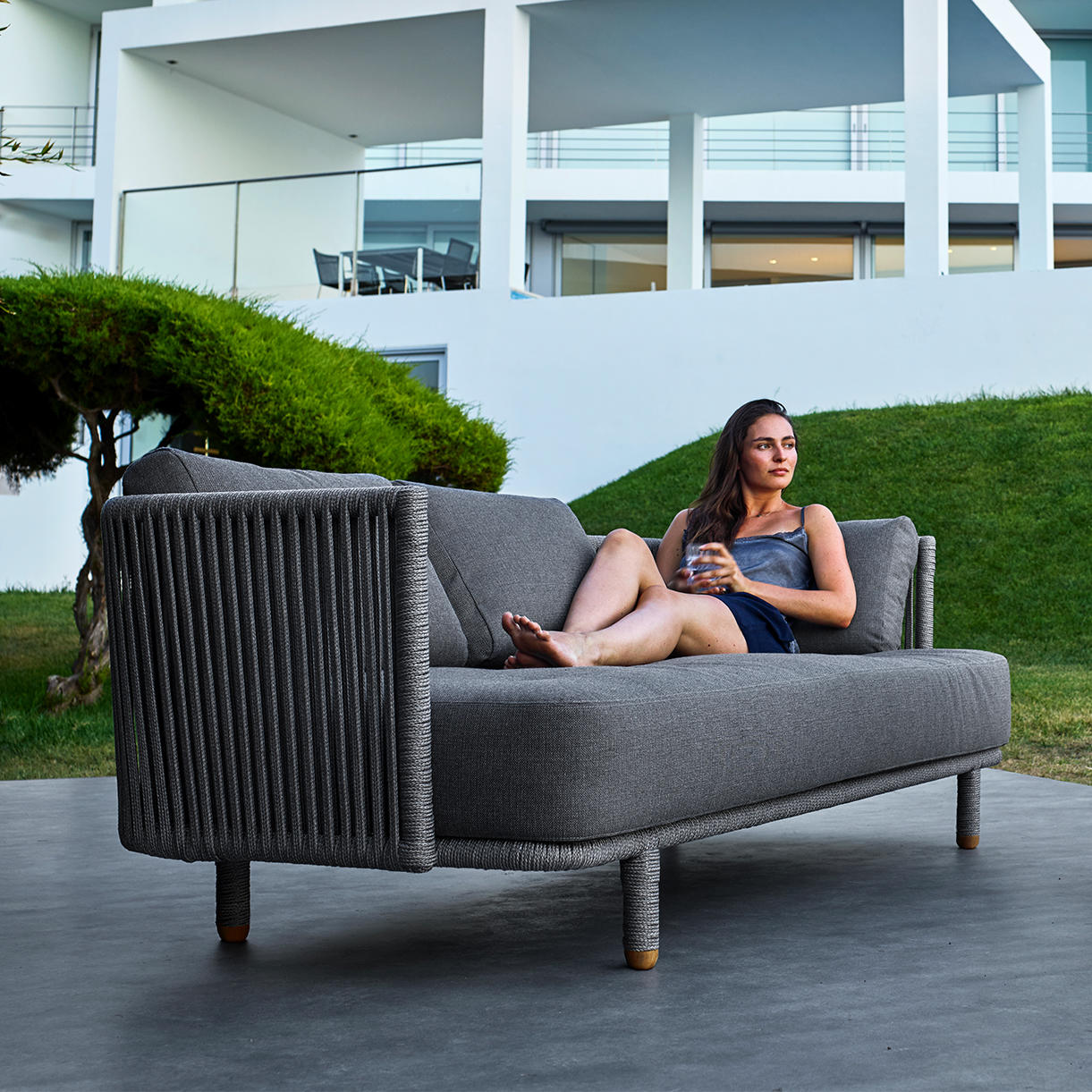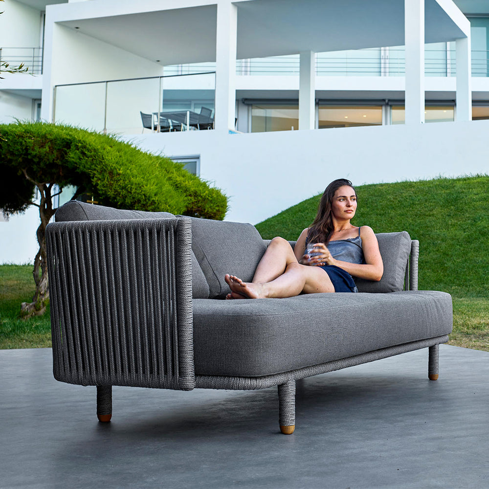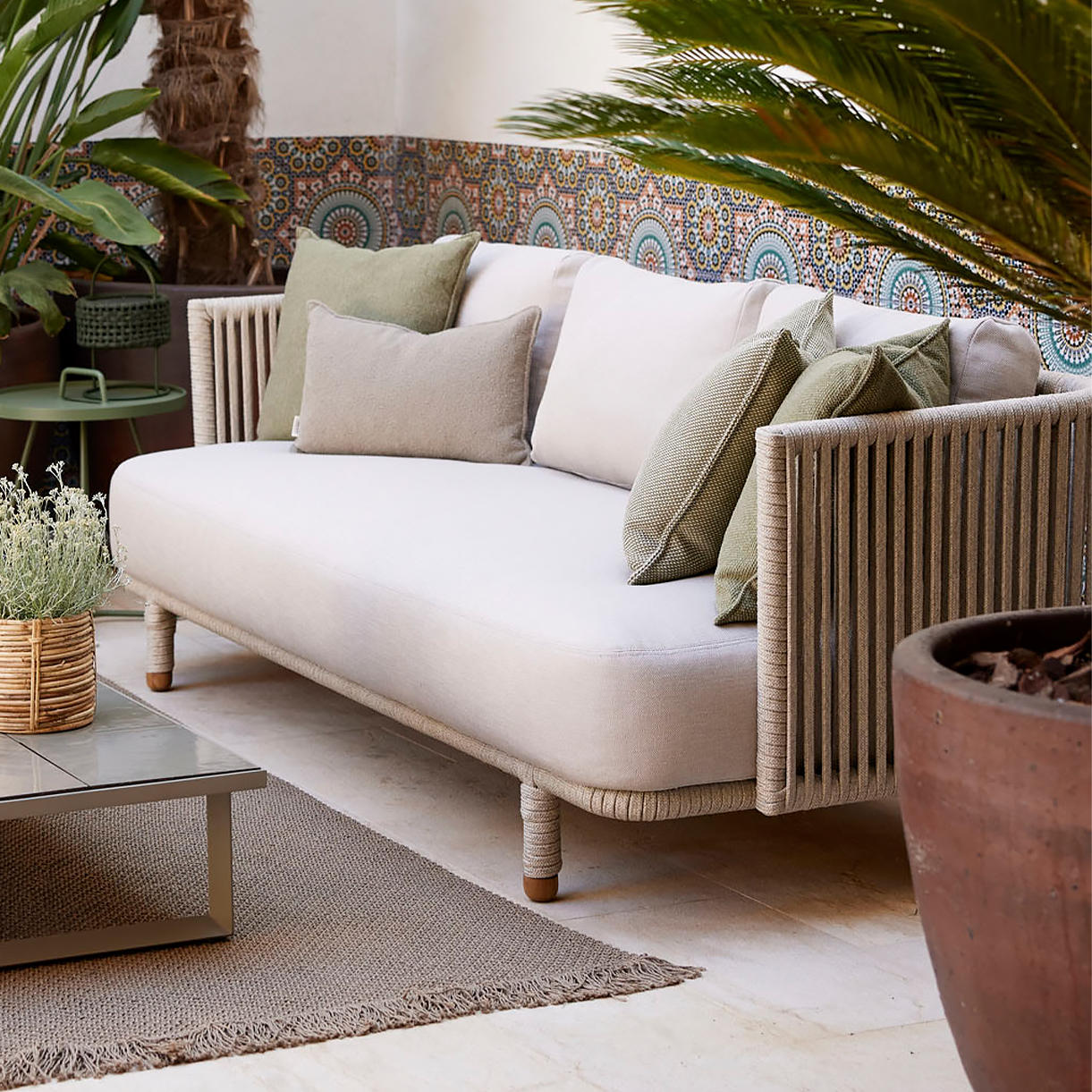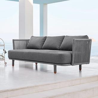 The sofa is produced using Cane-line all weather Soft Rope and AirTouch QuickDry fabric cushions, over a powder coated aluminium frame with teak detailing.