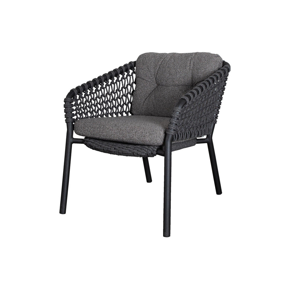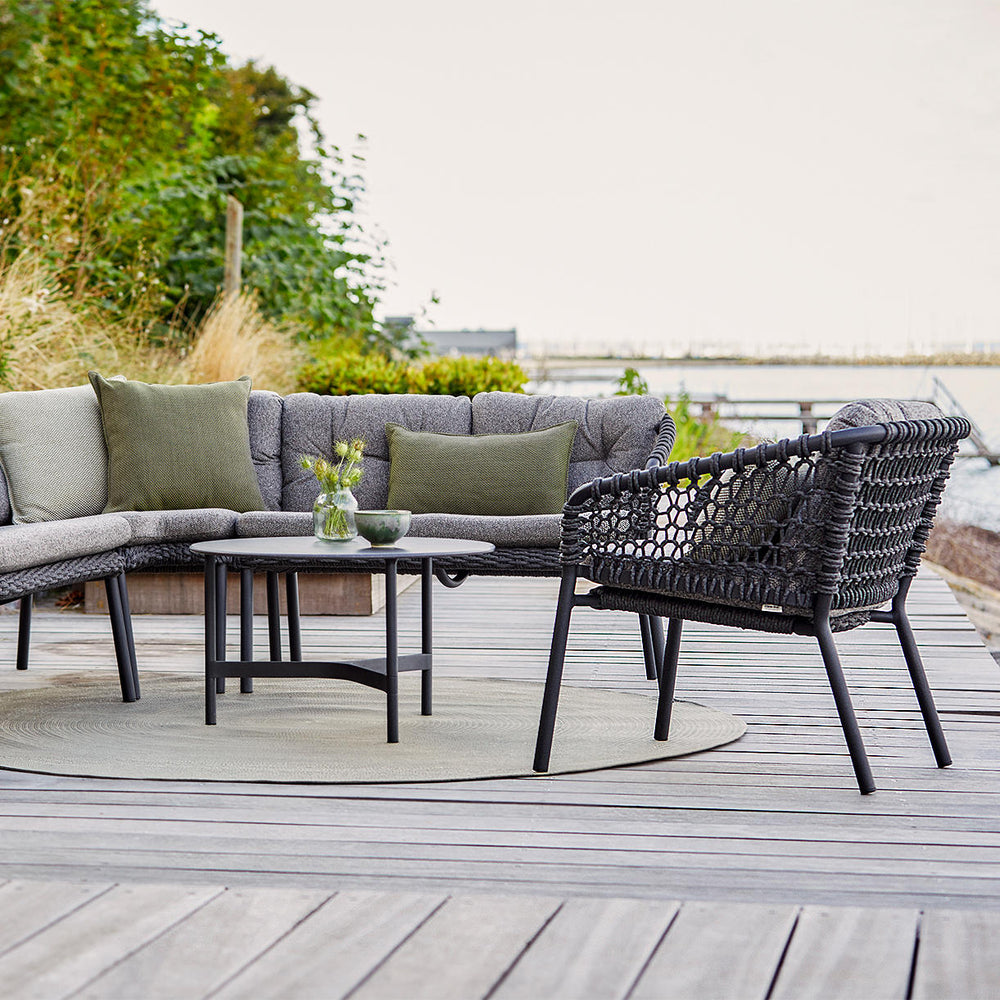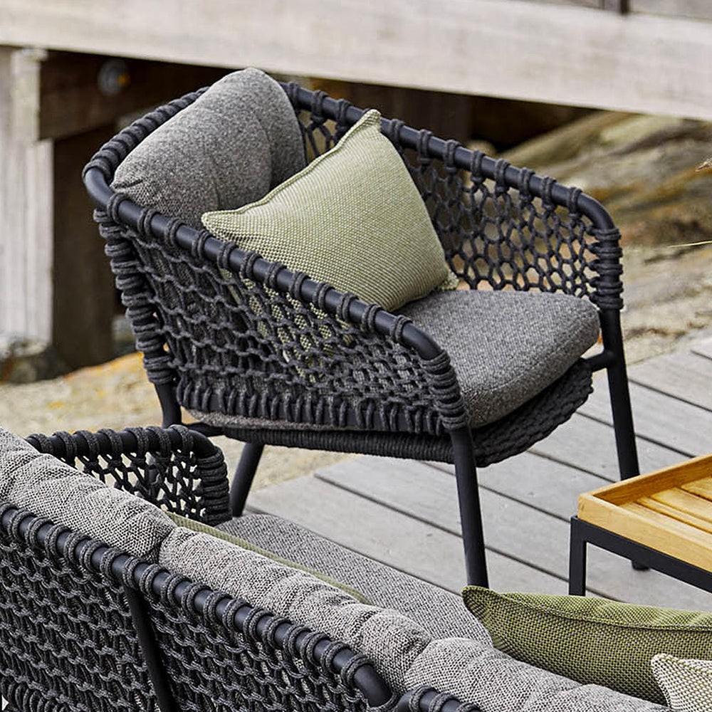The chairs are produced using Cane-line all weather Soft Rope and all weather Soft touch QuickDry fabric cushions, over a powder coated aluminium frame.