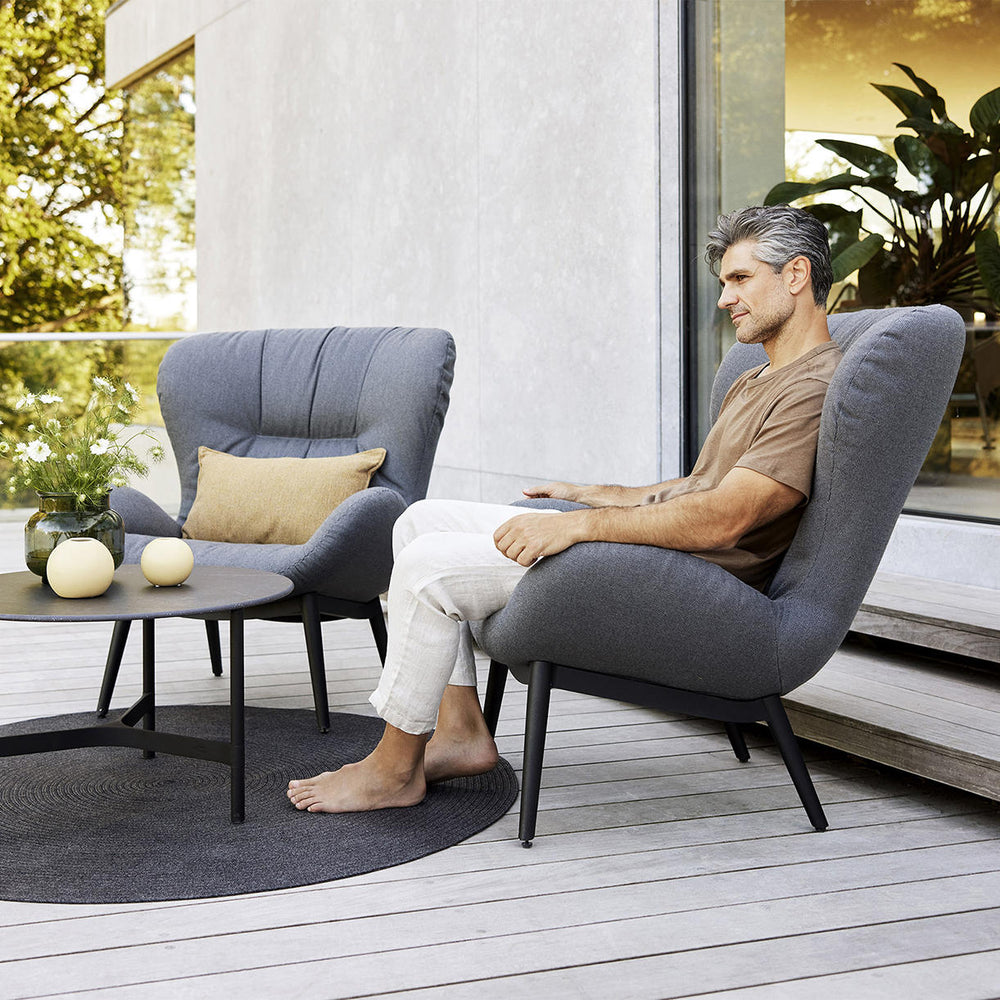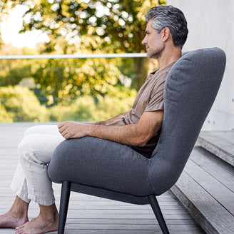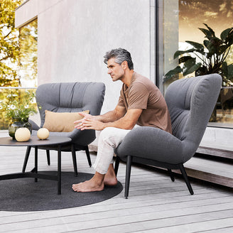 The lounge chair is the essence of Scandinavian design with a high level of comfort and soft grey Cane-line AirTouch fabric.
