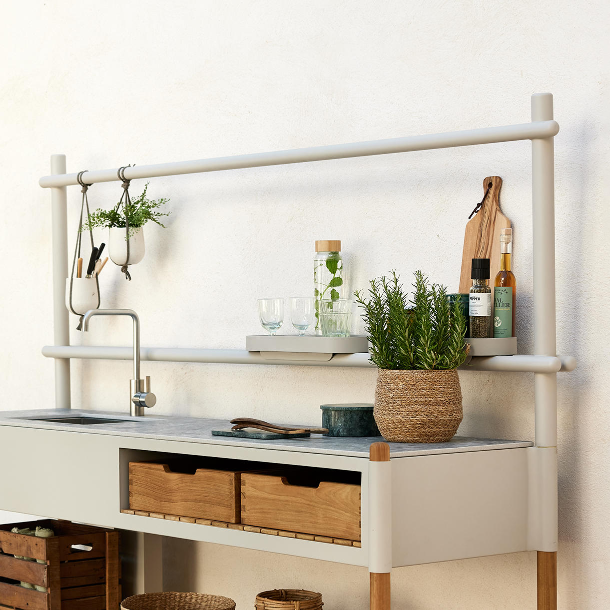 This outdoor kitchen design seamlessly blends natural charm with modern innovation, this modular storage system brings efficient organisation to your outdoor space.
