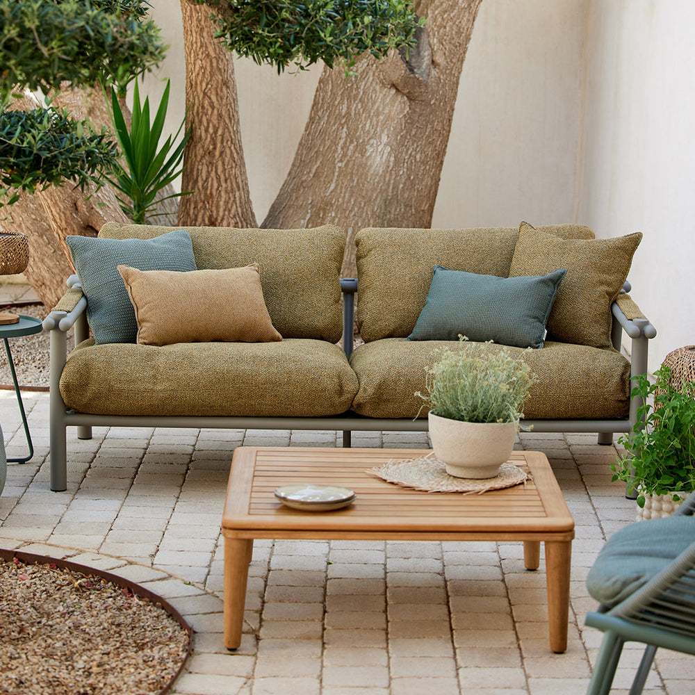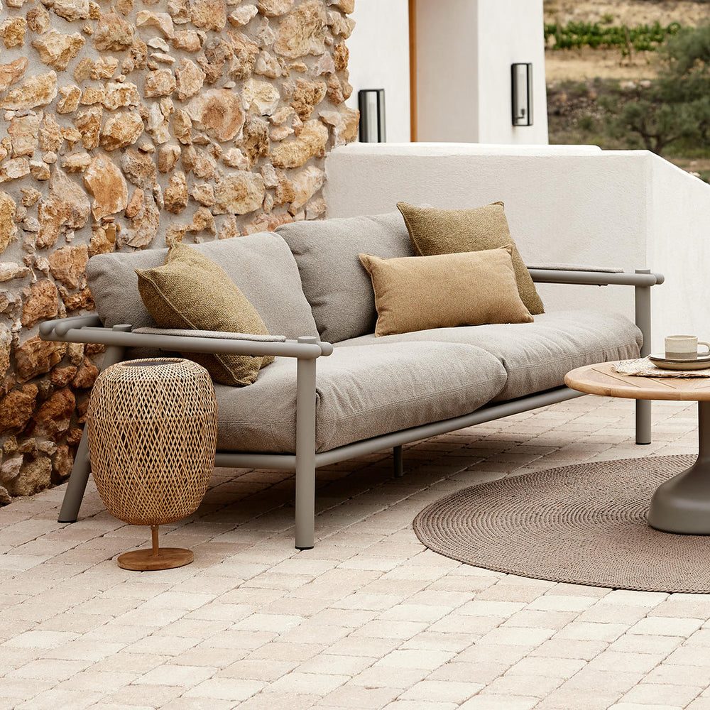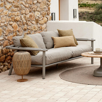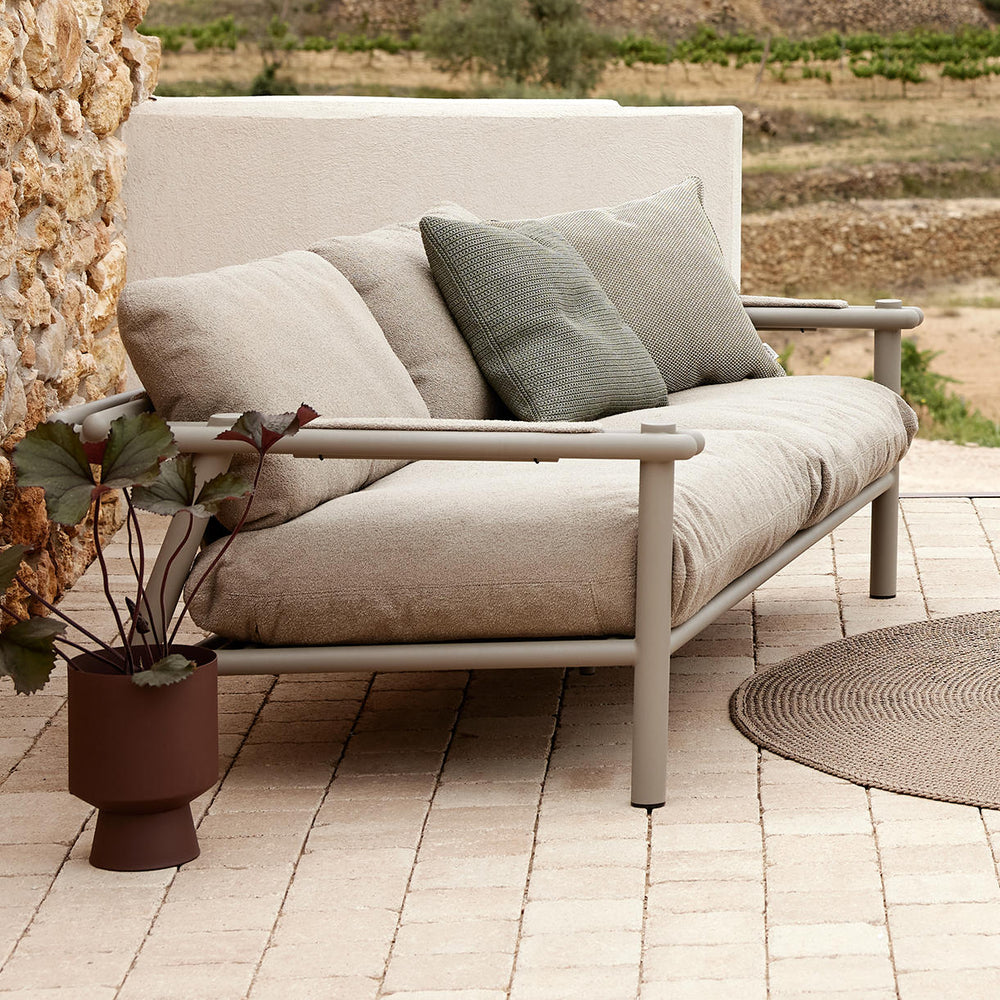 The sofa is shown here accessorised with scatter cushions from the Cane-line wove collection.