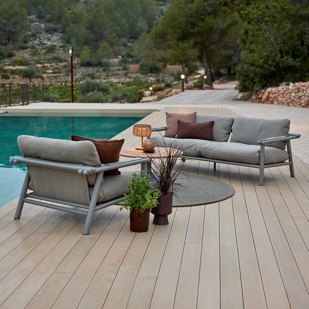 The seat and back cushions are available in a choice of 3 different outdoor fabrics, Rise, Free and Natte: