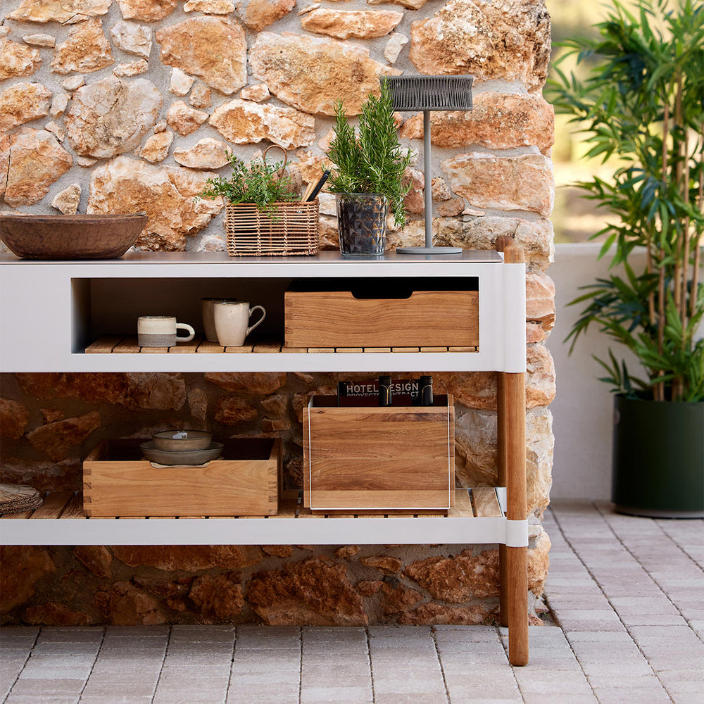 Drawing inspiration from the timeless elegance of teak with the sleek lines of aluminium and a classic ceramic work surface. This is a practical outdoor work station which can be used for chopping, preparing, using for small pizza ovens or outdoor stoves.