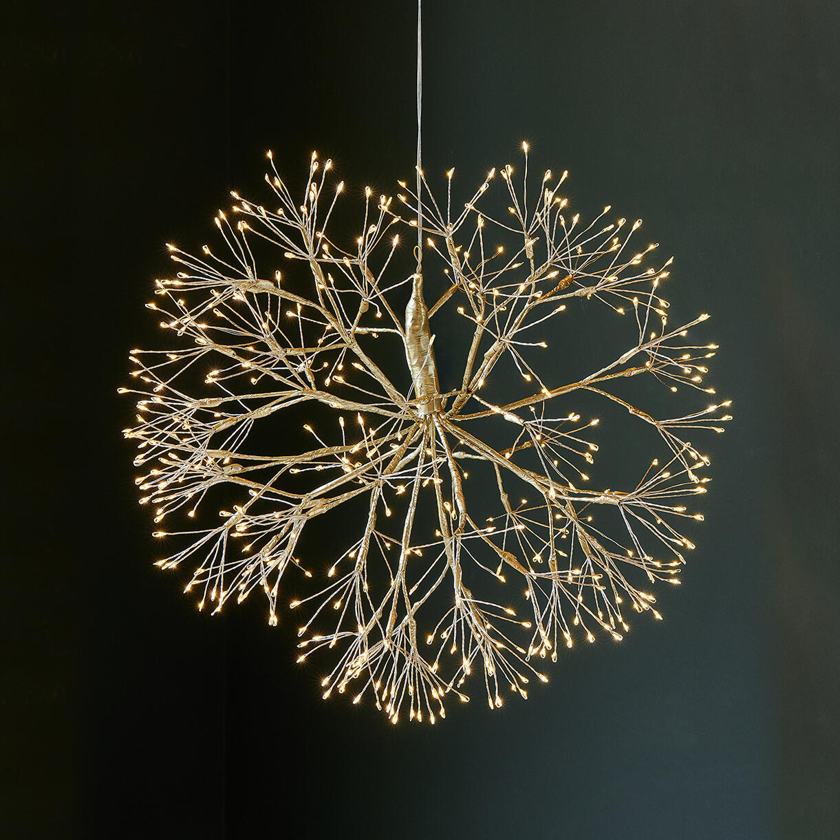 This oversized 40cm LED Dandelion light sphere adds a striking touch of sparkle to any interior. Its golden frame holds a stunning 456 LED warm white lights, casting a soft, radiant glow that feels both modern and refined.