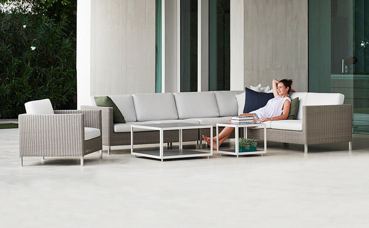 This arrangement is ideal if you have a larger outdoor space to fill, and is perfect for having a few friends round on a balmy summer evening. Stripe and Divine cushions add extra comfort and a pop of colour, off set against the white seat cushions of the Connect, and the white and grey coffee tables.