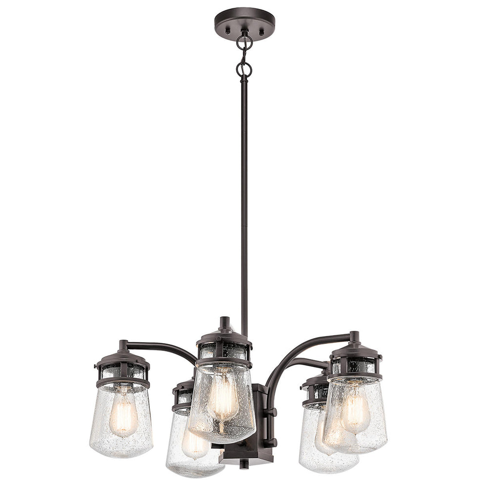 It combines a simple streamline design with an emphasis on traditional details, the chandelier has a beautiful architectural bronze finish and 5 clear seeded glass lanterns.
