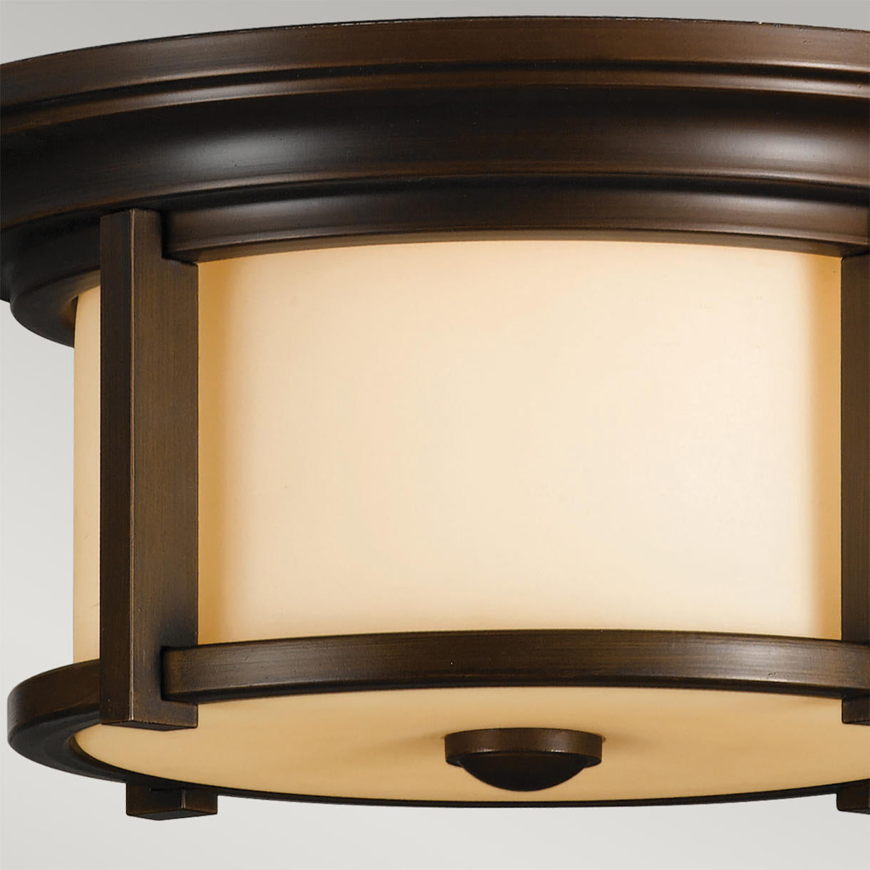 The Merrill collection by Feiss has a modern geometric shape and is in a heritage bronze finish. The glass is cream etched which gives a versatile look for both modern or traditional locations.