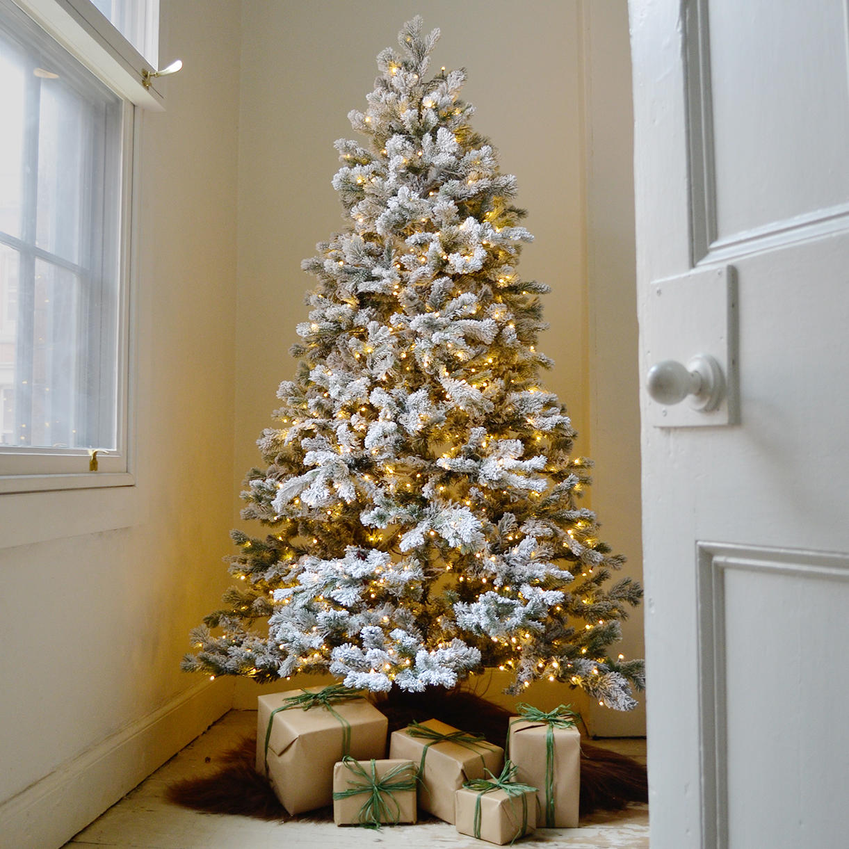 This stunning 'snowmelt' covered indoor Christmas tree is bathed in 800 warm white LED lights.