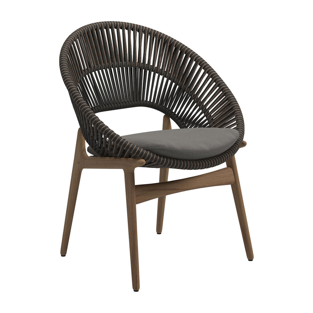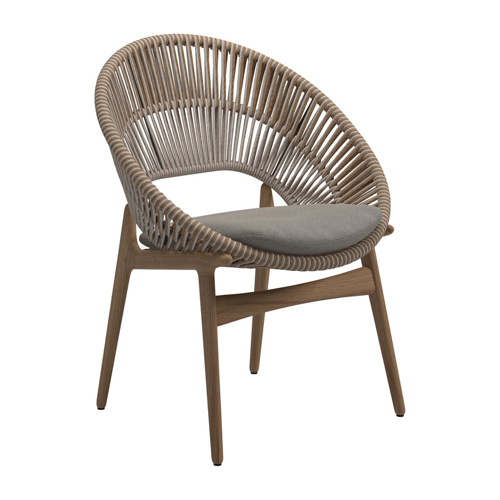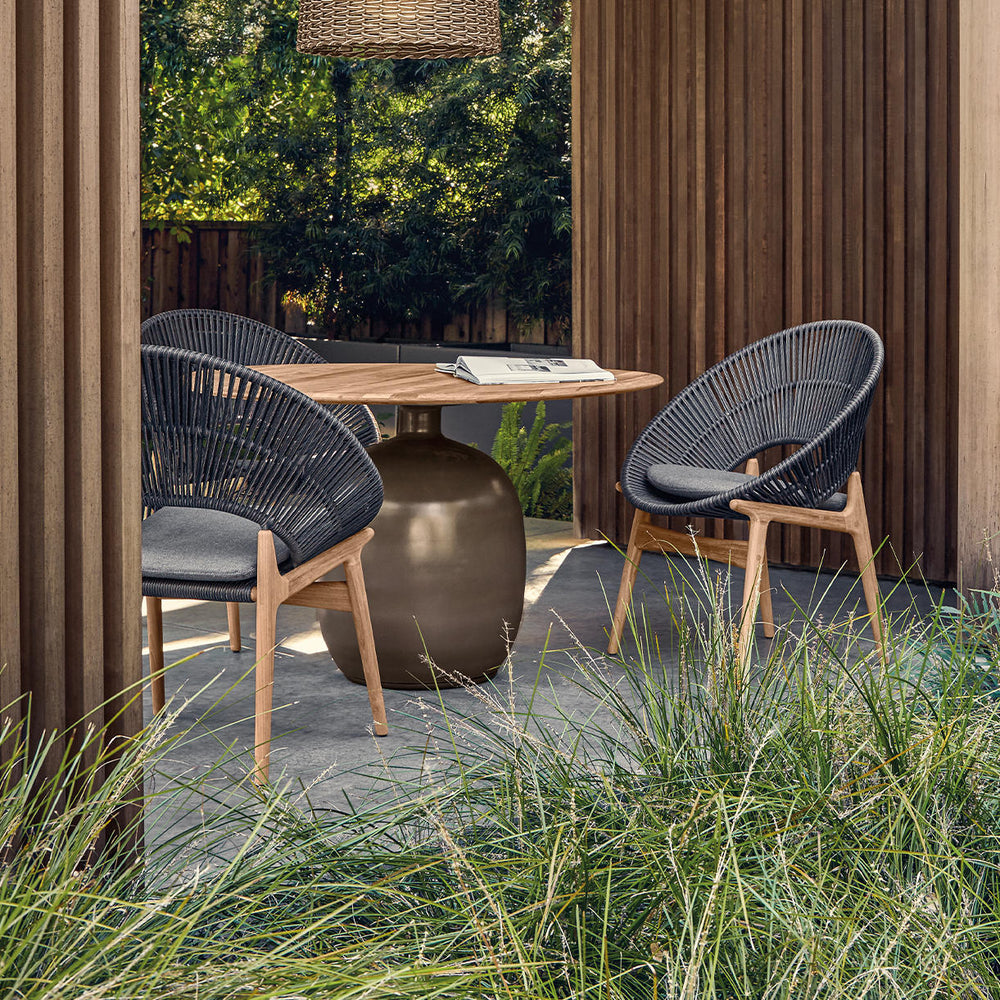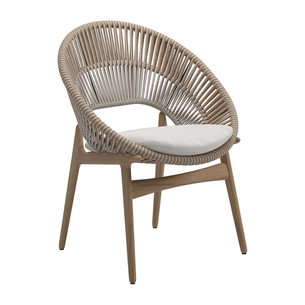 The Bora dining chair by Gloster is a combination of the tactile and the ethereal, the dining chair combines the fine craftsmanship of an expertly crafted teak frame with the rounded expression of circles, extended to a soft and inviting seating comfort.