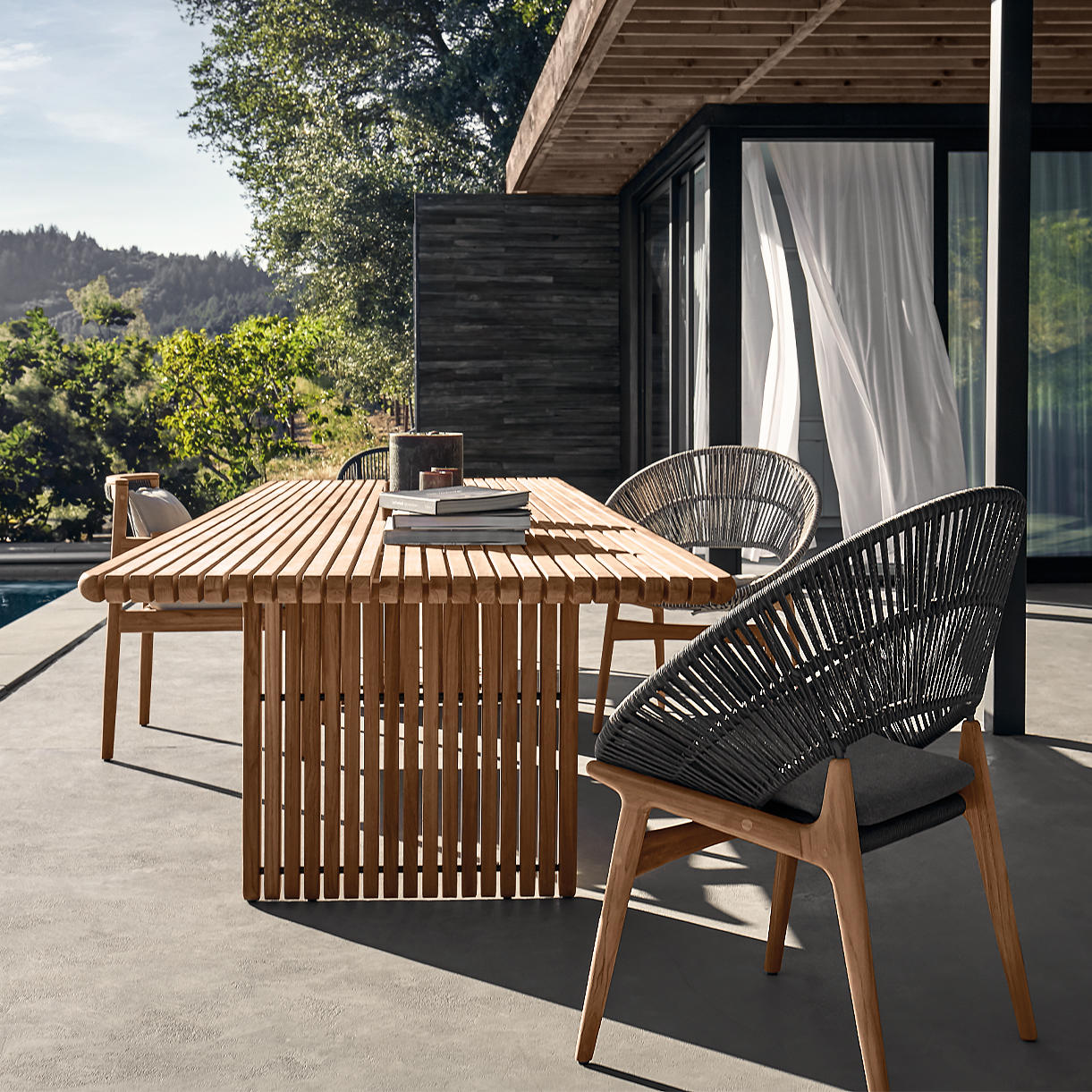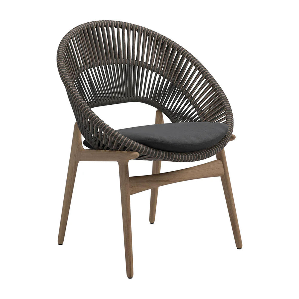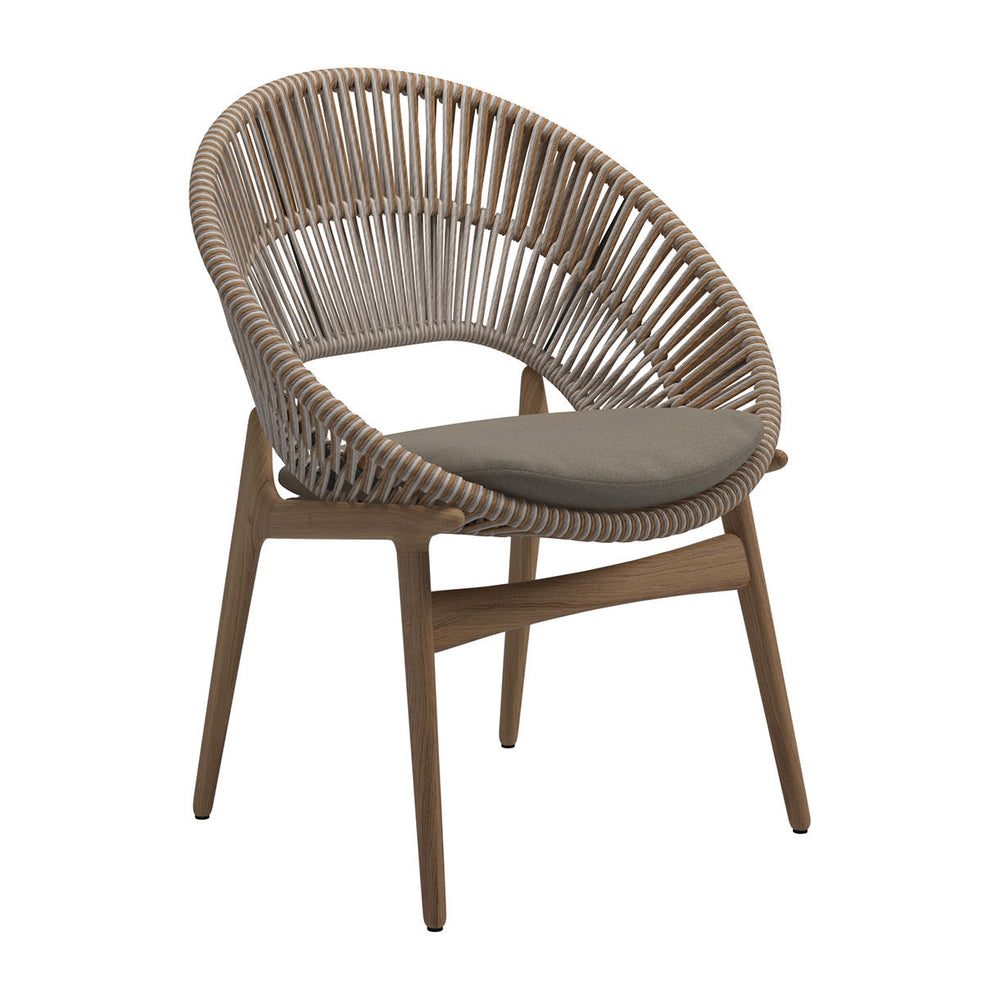 The Bora dining chair by Gloster is a combination of the tactile and the ethereal, the dining chair combines the fine craftsmanship of an expertly crafted teak frame with the rounded expression of circles, extended to a soft and inviting seating comfort.
