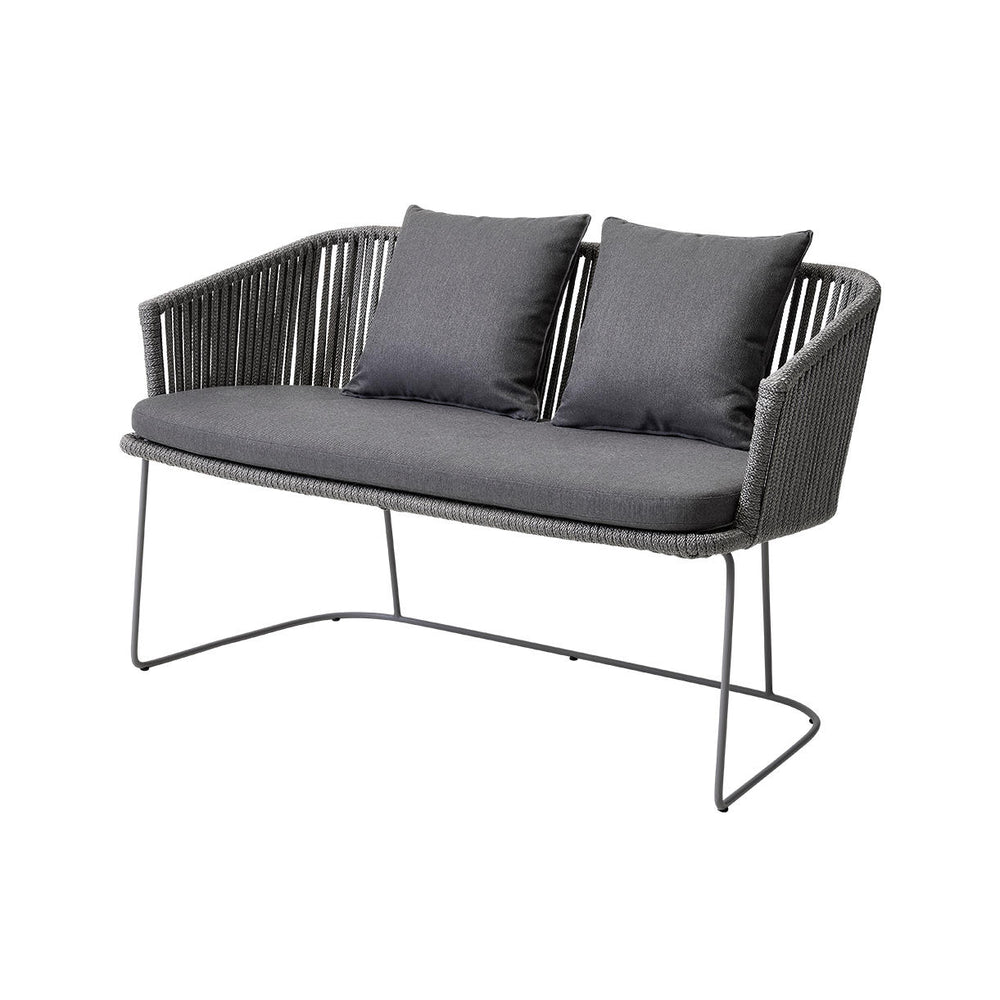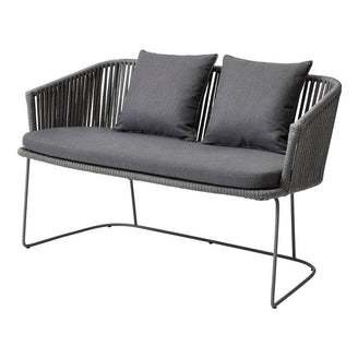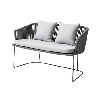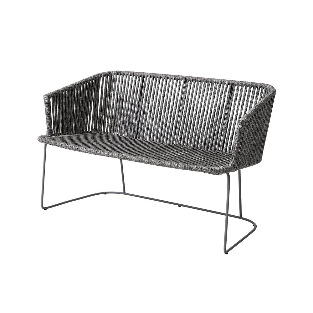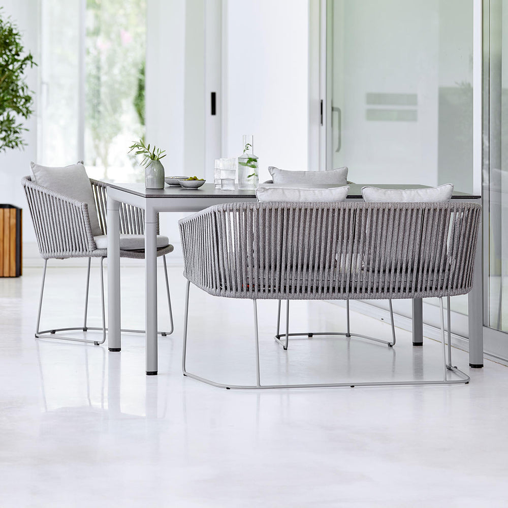 The bench is produced using Cane-line all weather Soft Rope and all weather Soft touch QuickDry fabric cushions, over a grey powder coated aluminium frame.