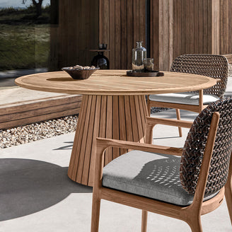The Whirl teak table is a delightfully different and gorgeous round table, symbolising infinity with its limitless design.