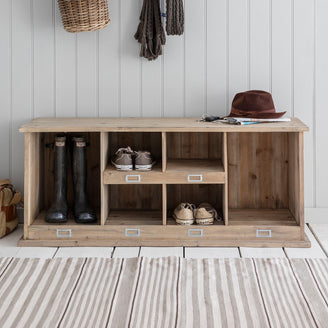 In a rustic style finish the low storage locker neatly holds 2 pairs of wellies and 4 pairs of shoes, with a practical bench seat to sit on so there is no struggling or hopping on 1 leg whilst struggling to pull your boots on.