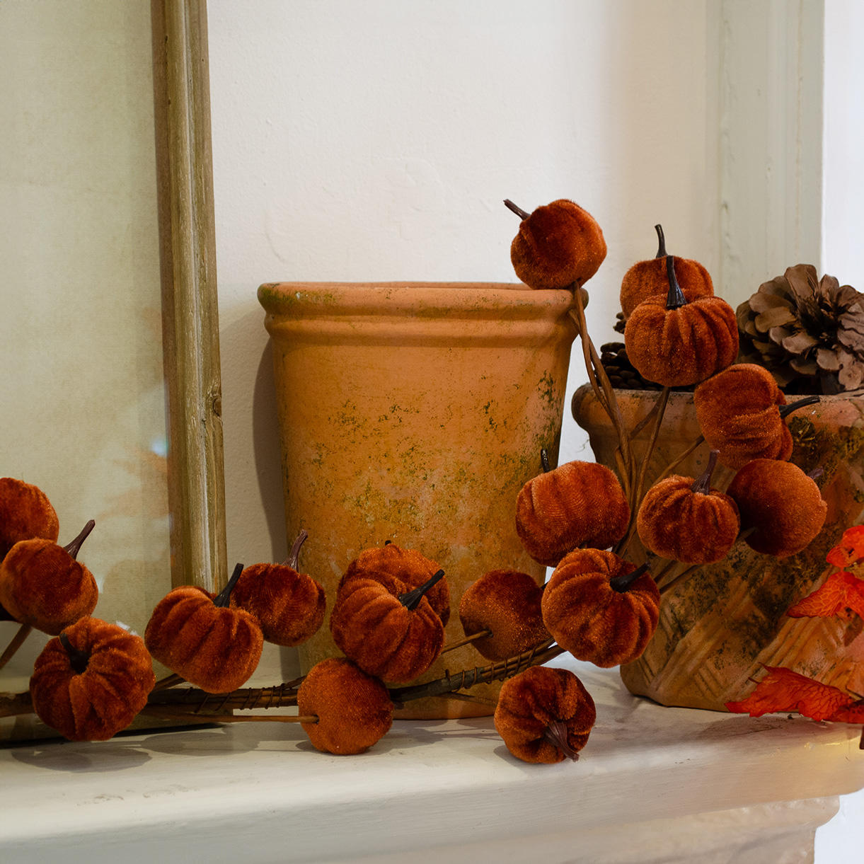 Add a touch of seasonal elegance with our sophisticated Autumn garland. Adorn your table with this luxurious arrangement featuring vibrant orange velvet pumpkins to create a stunning focal point.