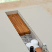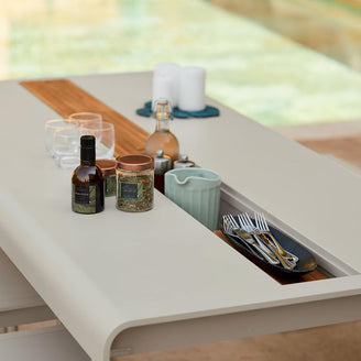The addition the Bellevie Storage table has over the classic Bellevie is a storage rill which runs along the centre of the table allowing discreet storage of cutlery, placemats etc to be stored. Or when the table is in use a great way to hold bottles of wine or water, flowers and such. There is drainage at either end of the table.