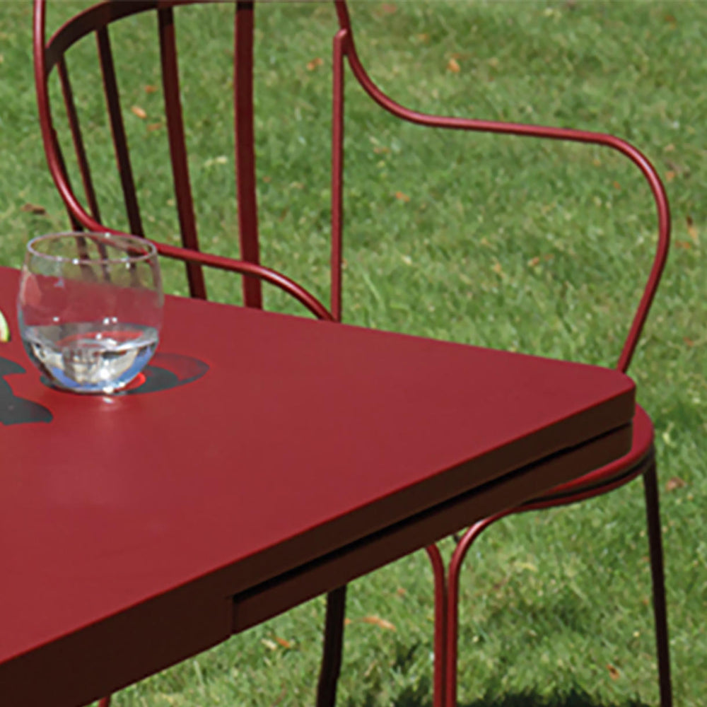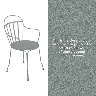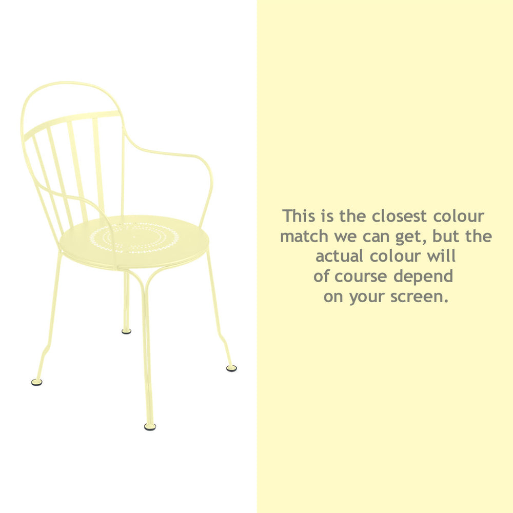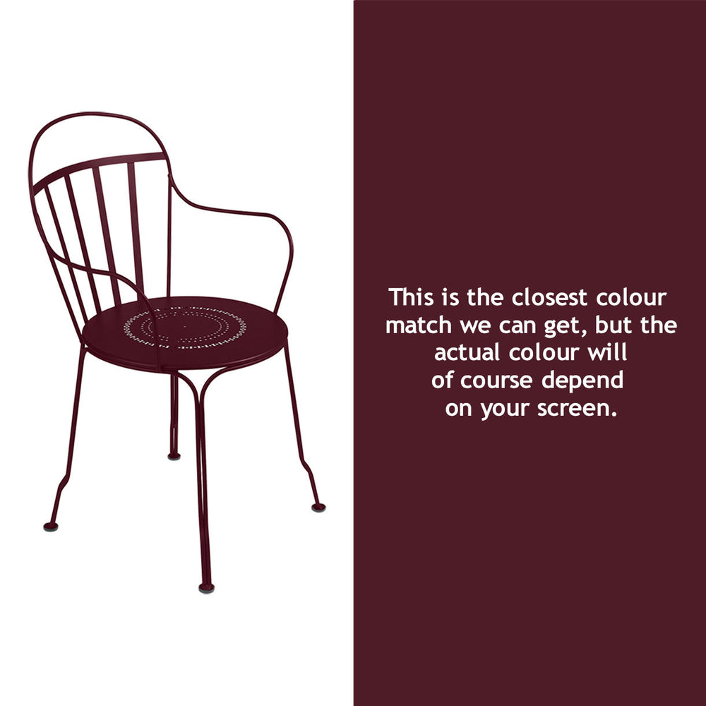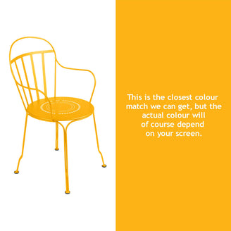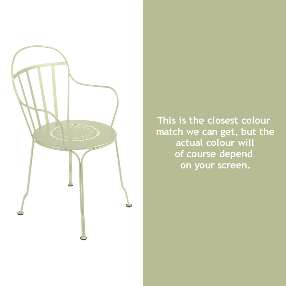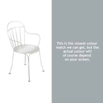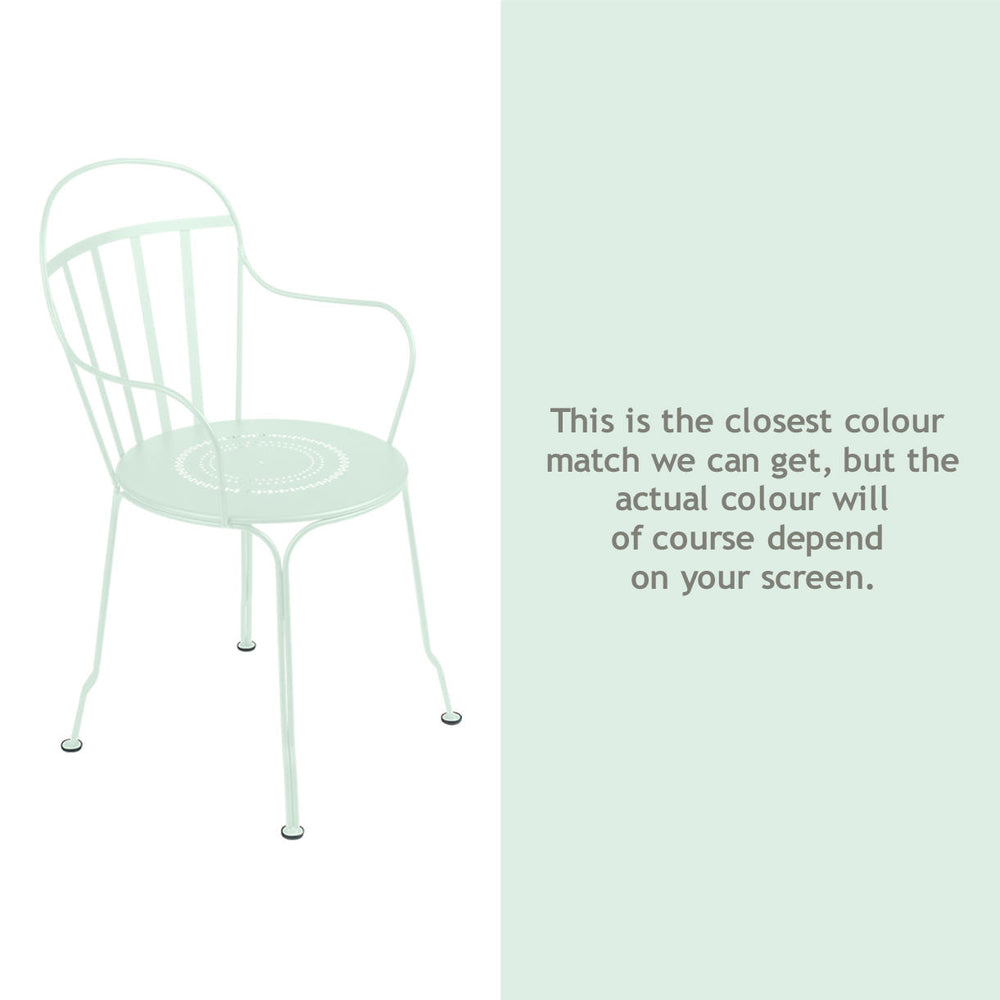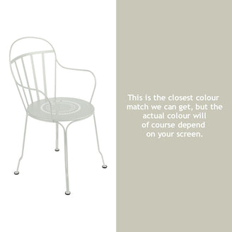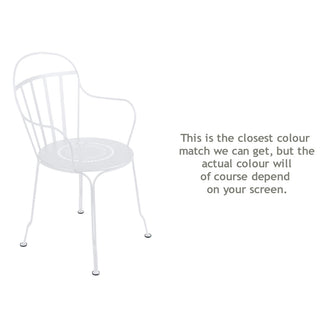 Metal garden armchairs in traditional French style that can be stacked for easy storage.