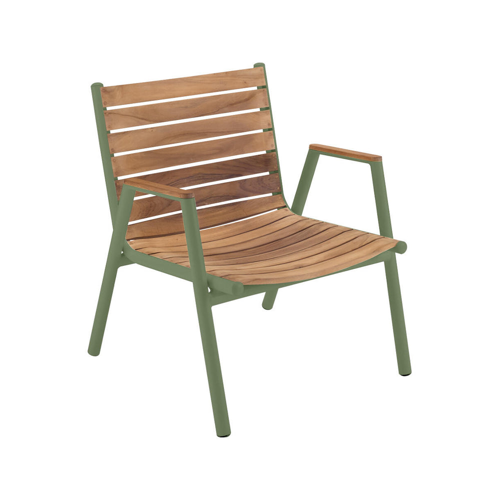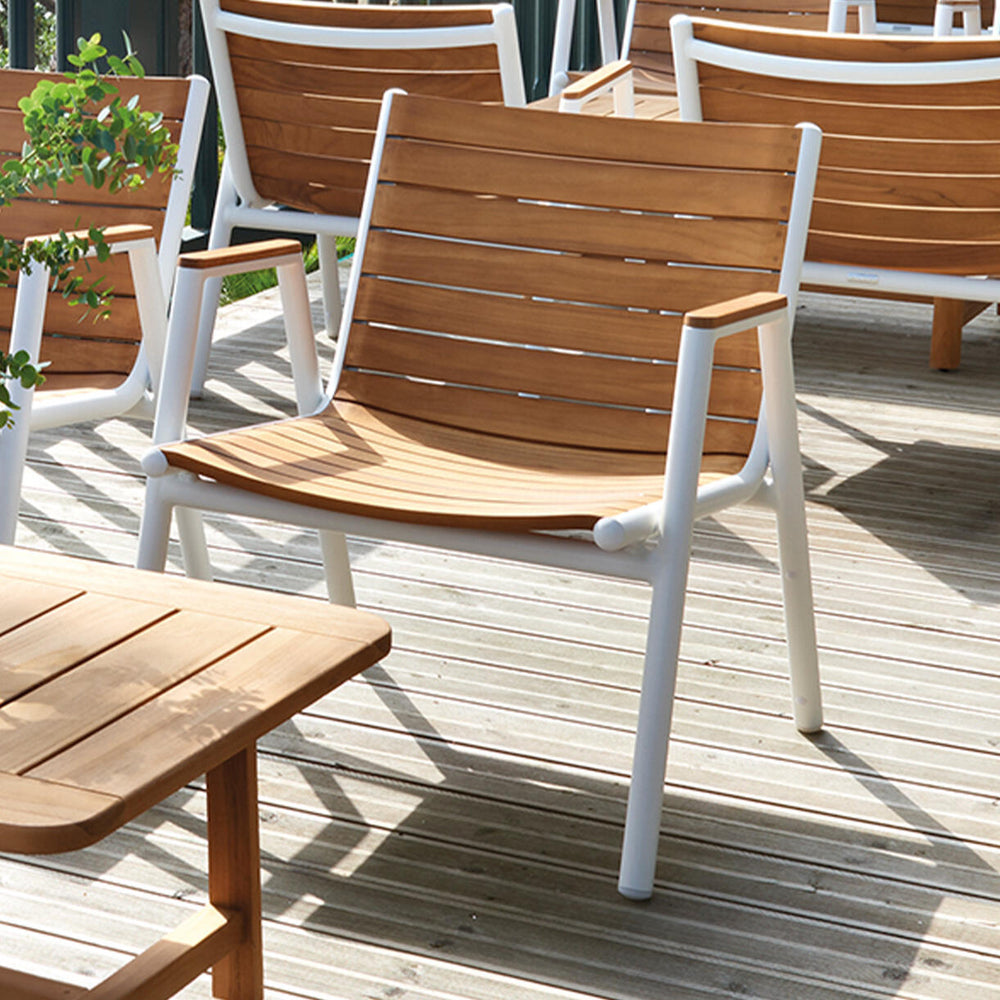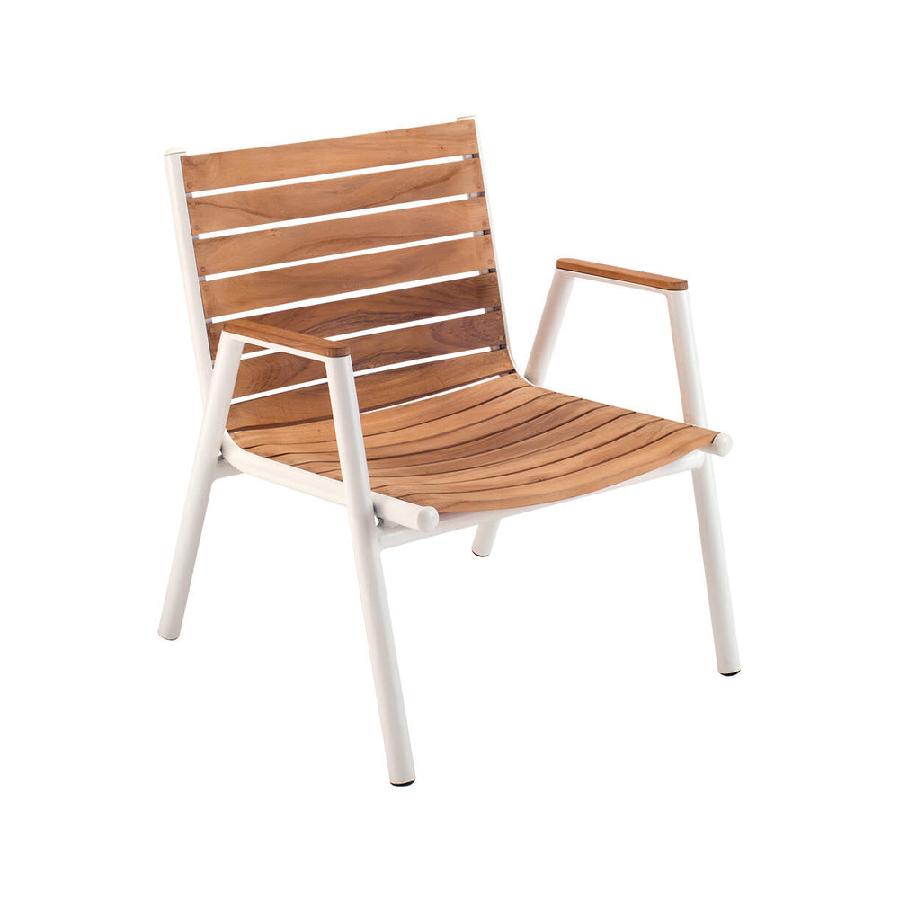 Sit back and unwind, the Pilotis Low Armchair by Fermob has a lightweight aluminium frame with natural teak slatted seat and back, perfect for effortless, easy going outdoor relaxation.