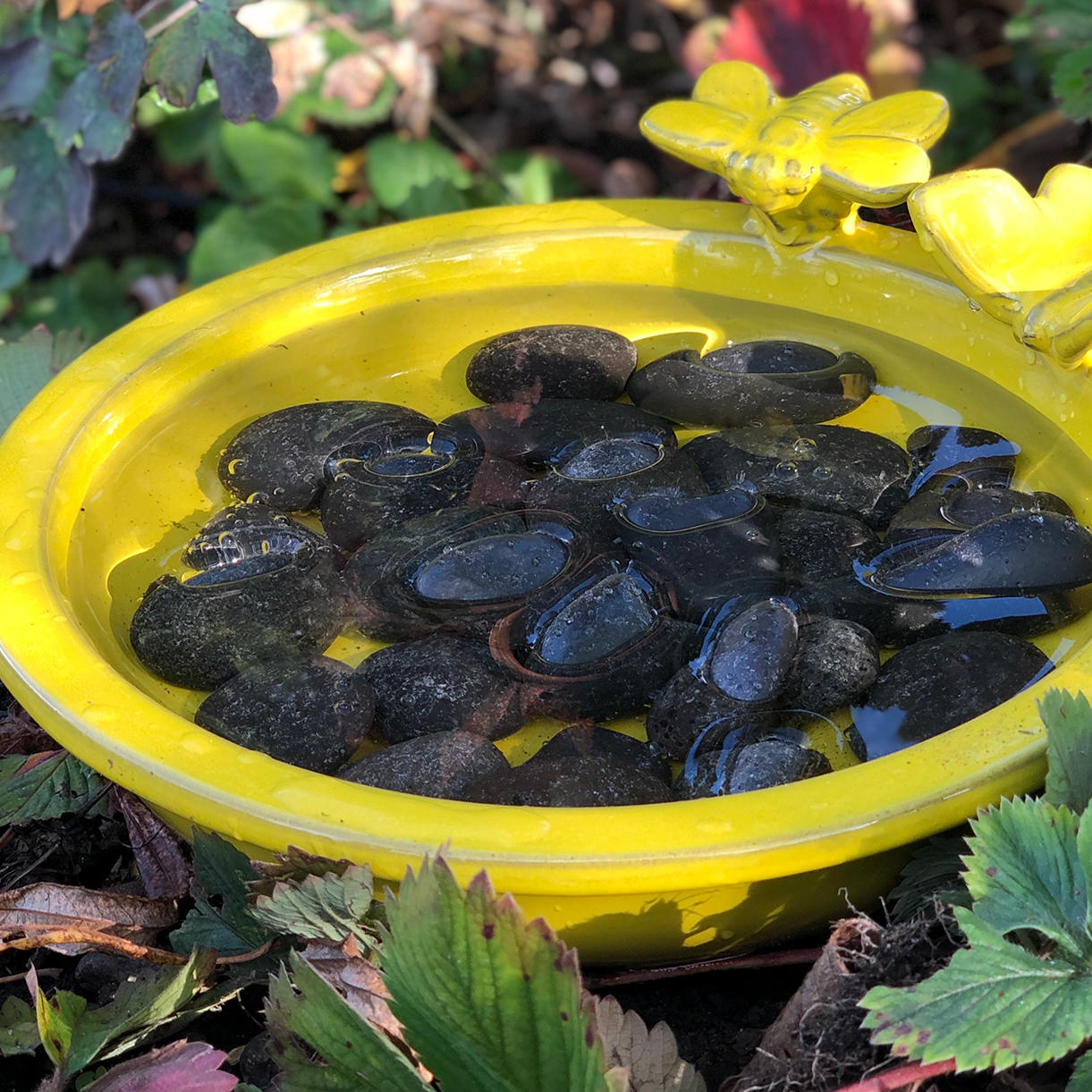 The bath consists of a bath with black pebbles so the bees and the butterflies have an ideal landing place and can access the water.