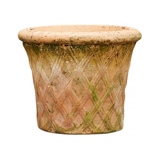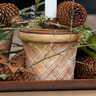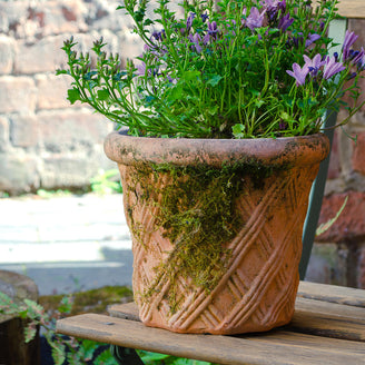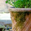 This delightful terracotta plant pot with a rustic vintage patina in green moss is ideal for for holding window sill herbs or patio plants.