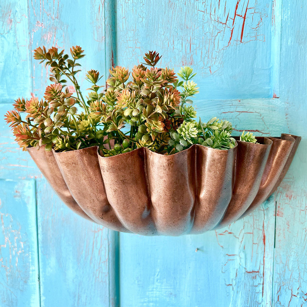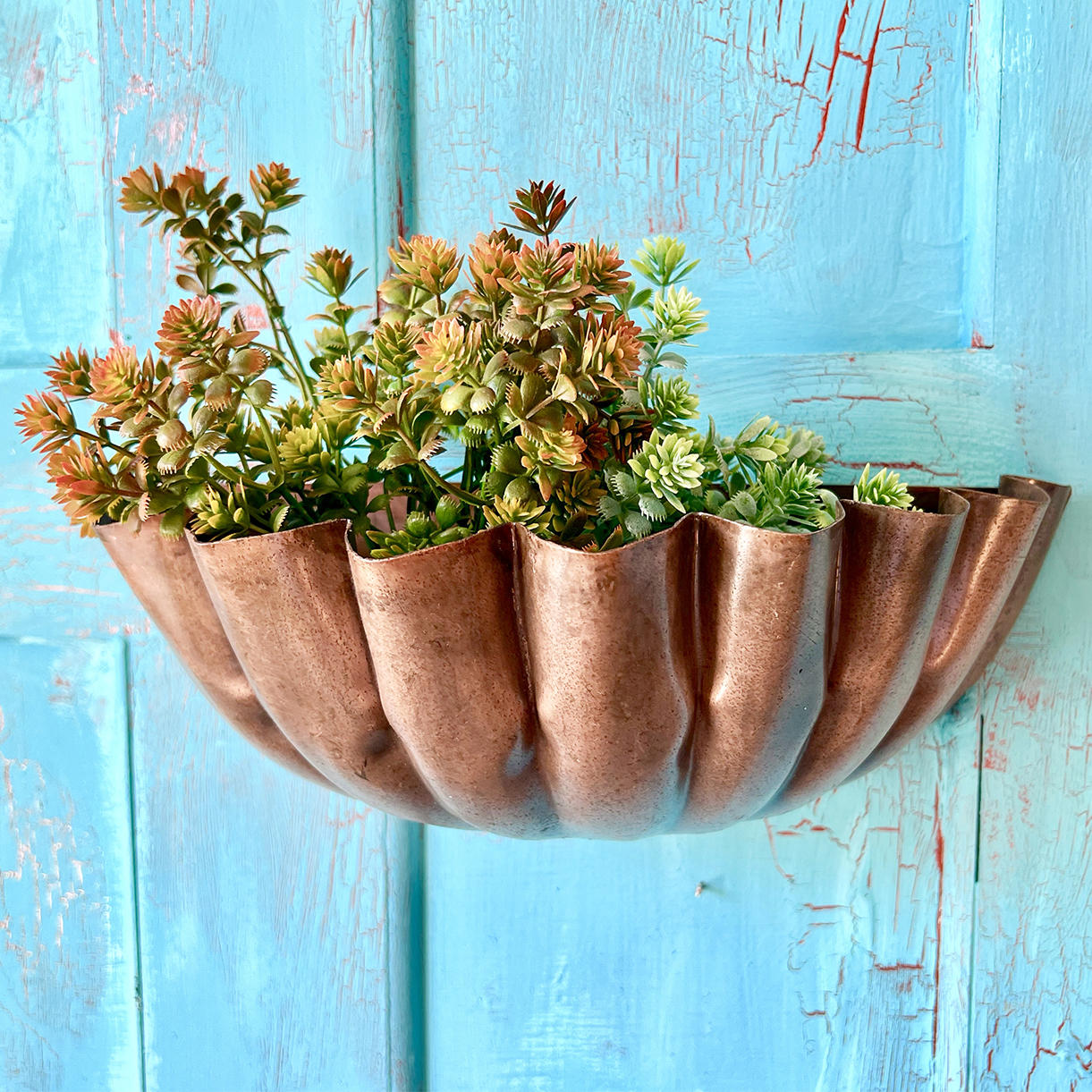 In a copper finish this scalloped shaped wall planter is ideal for smaller spaces in gardens or courtyards.