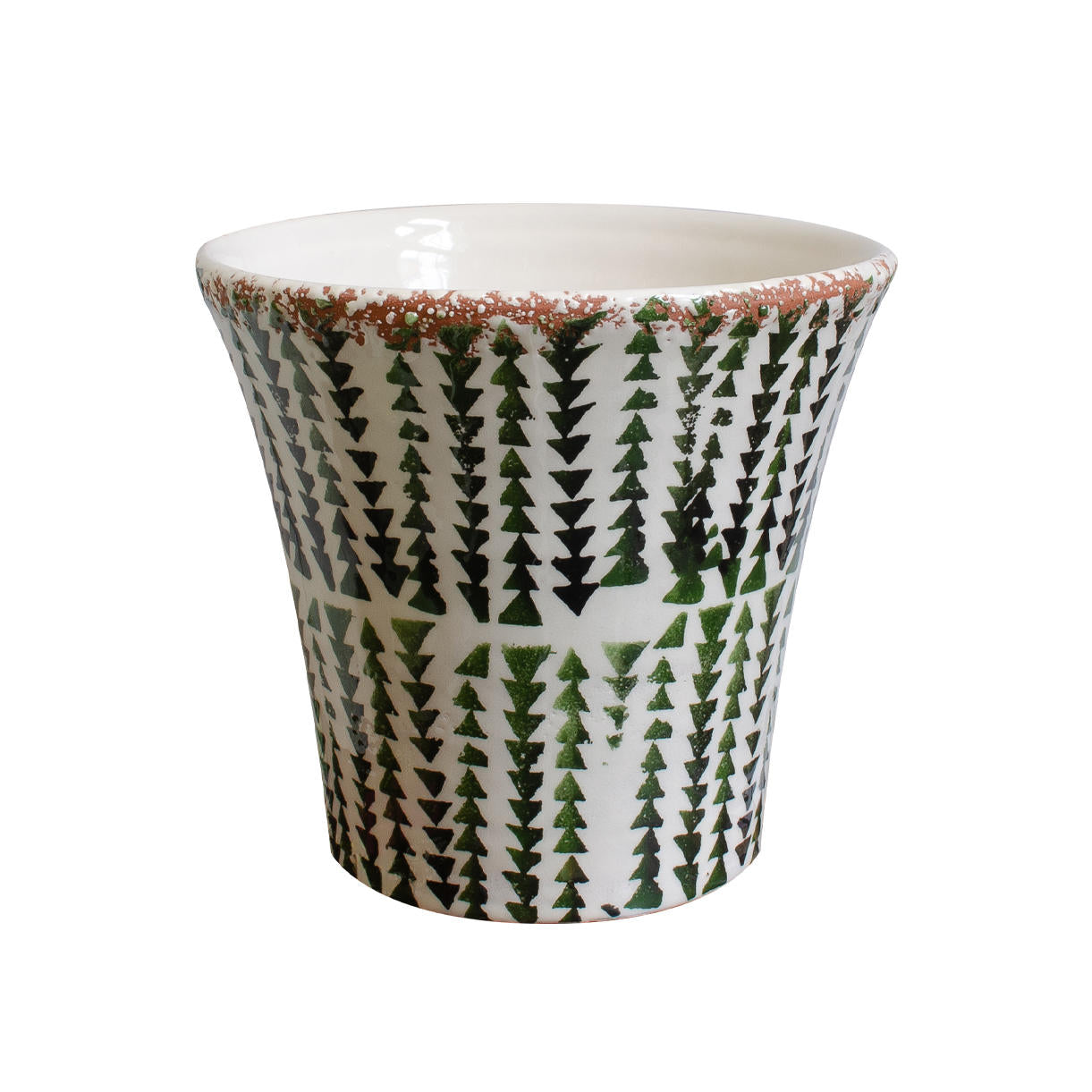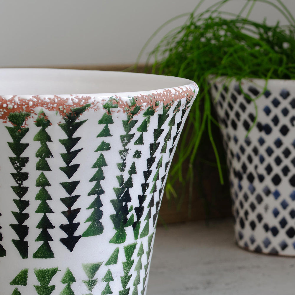This pot is a plant lover's dream with its sleek tapered design and eye-catching triangle tile pattern in a green and cream glaze.
