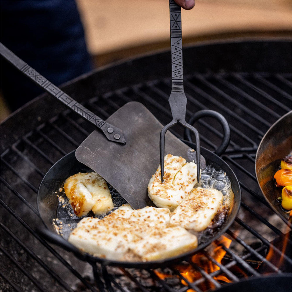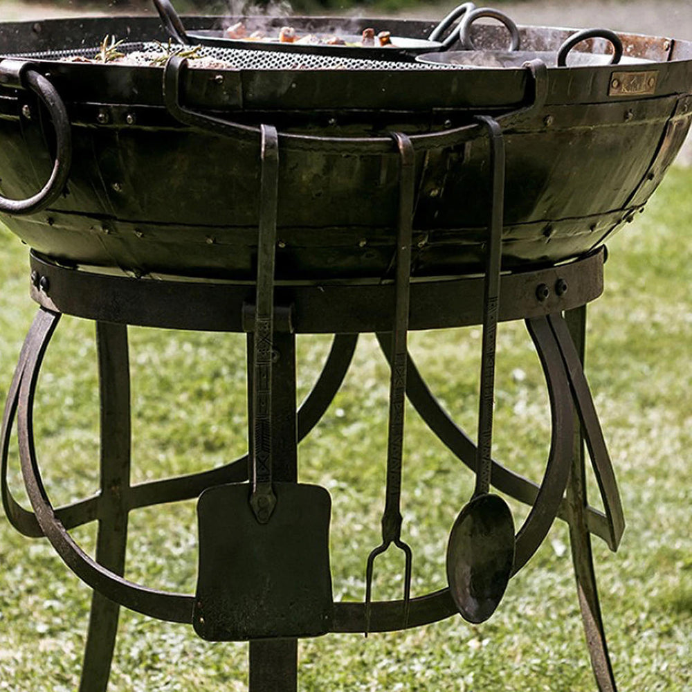 A set of practical 3 BBQ tools and a hand-forged hanger to hold them on to the edge of the Kadai, so they are easily to hand and ready for use.