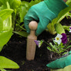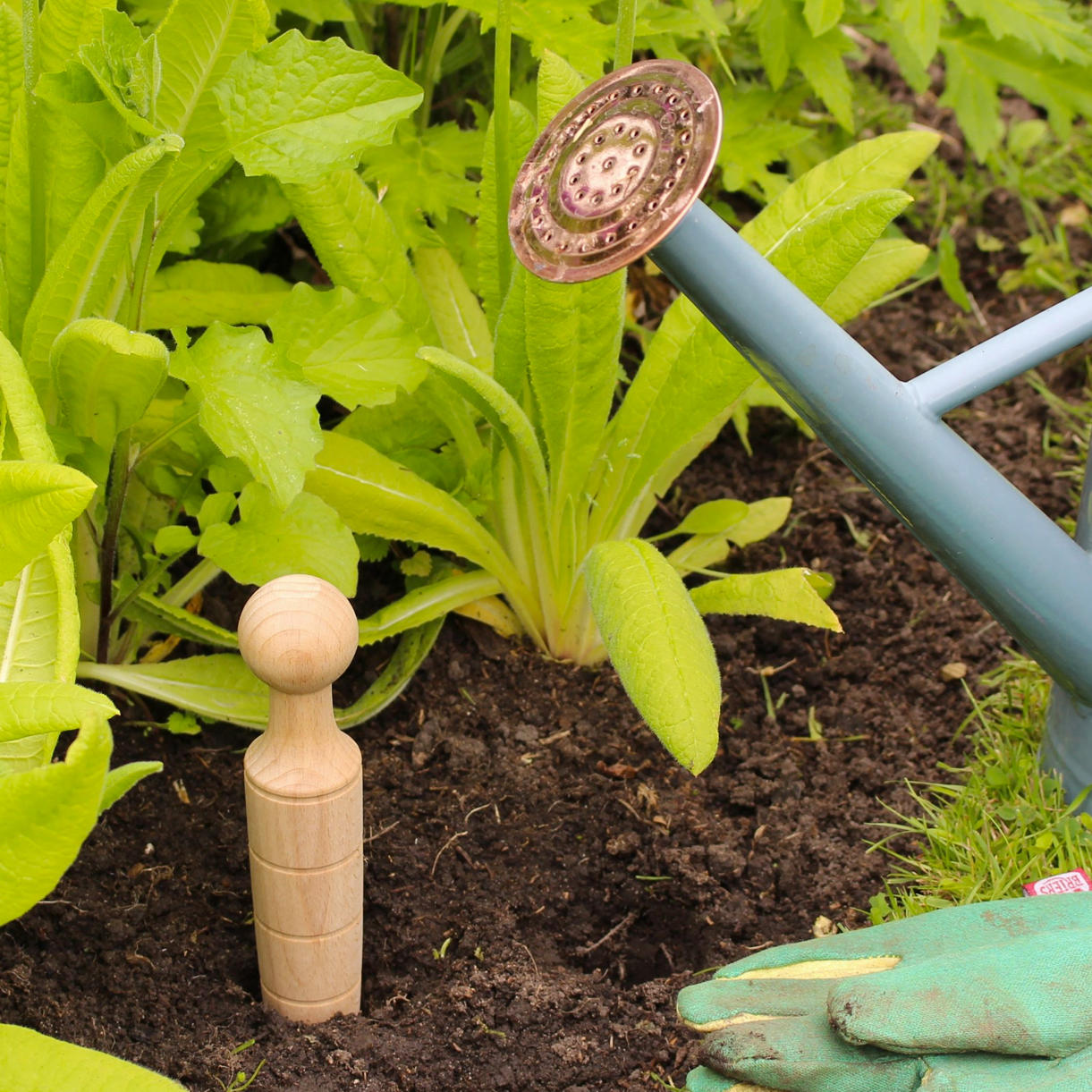 A turned wooden dibber and calibrated 1 inch marker for calculating the depth.