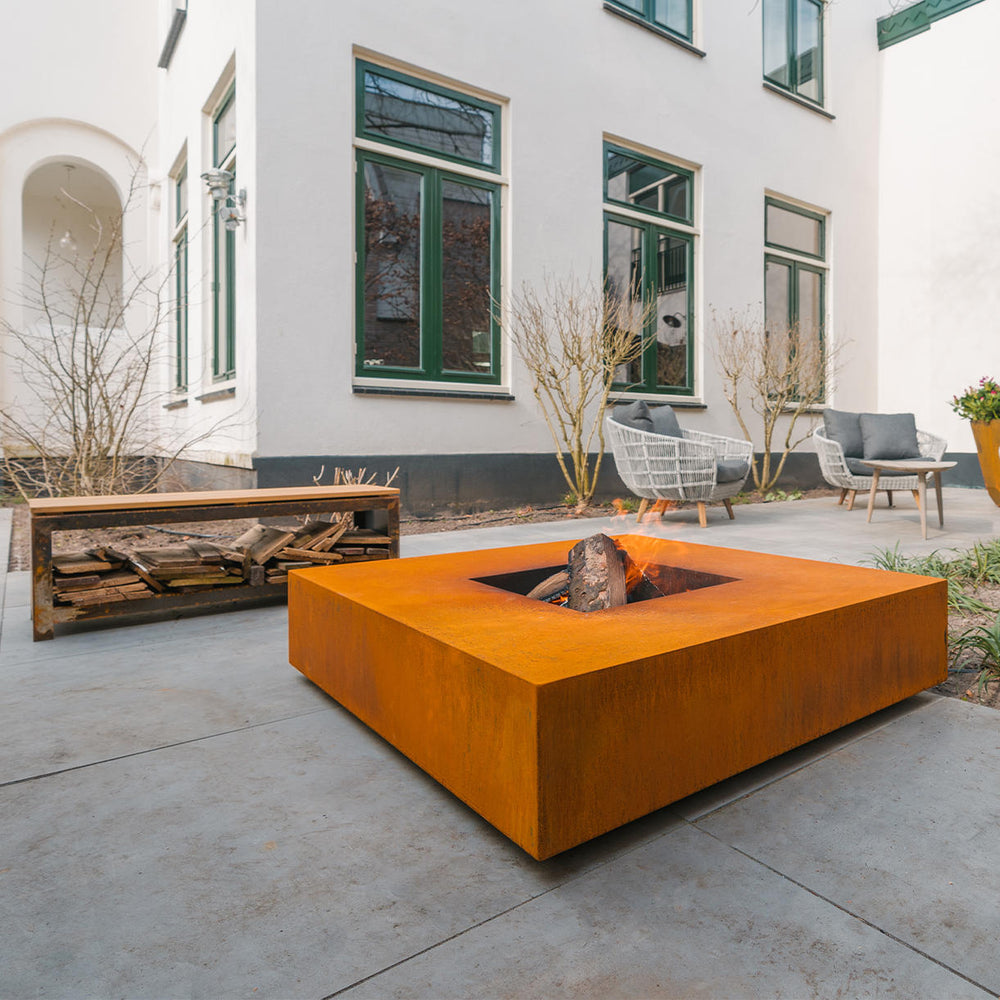 This garden fire pit has a sleek and timeless design, the simple shapes let you enjoy the warmth and atmosphere from all sides.