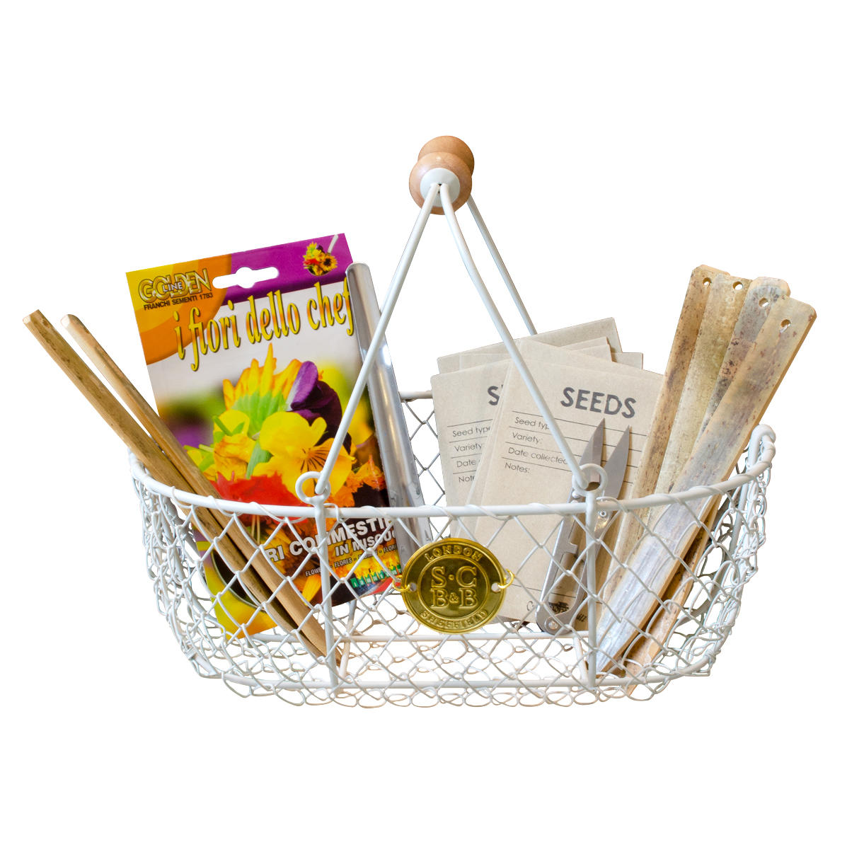 The cream wire basket is a lovely collecting basket for the edible flowers.