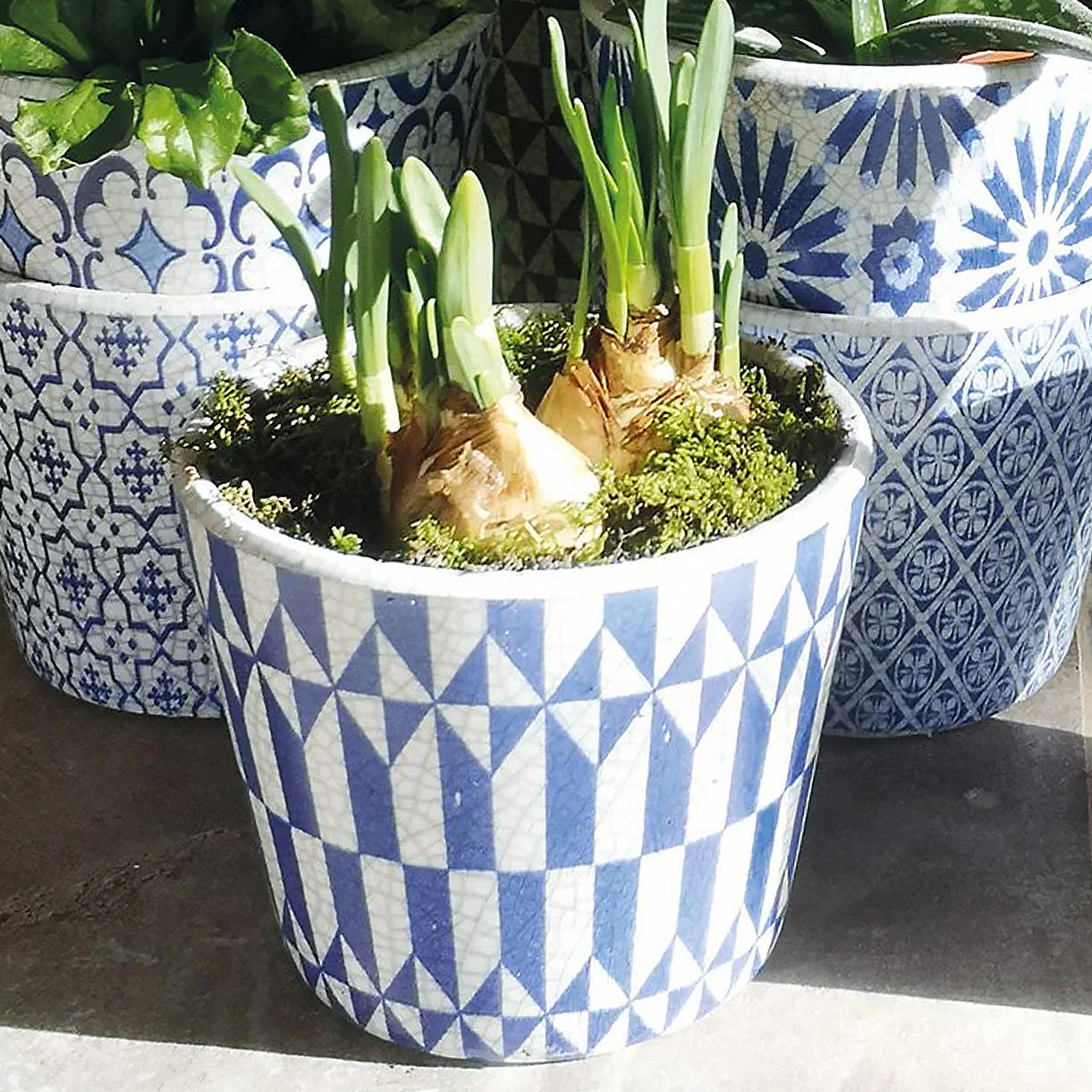 Bring a touch of Delft blue magic to your window sill. These glazed vintage-style plant pots, featuring a charming mix and match of Delft blue patterns, are perfect for showcasing your favourite herbs or small summer plants.
