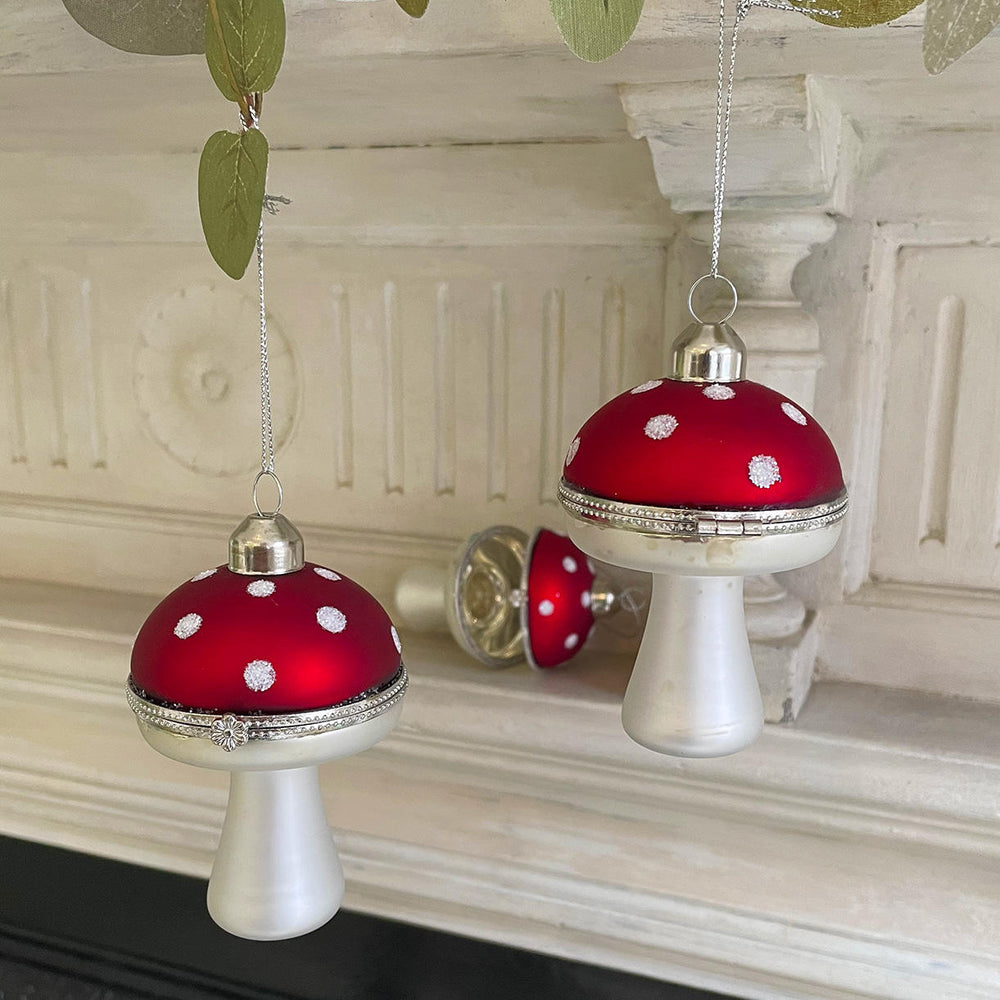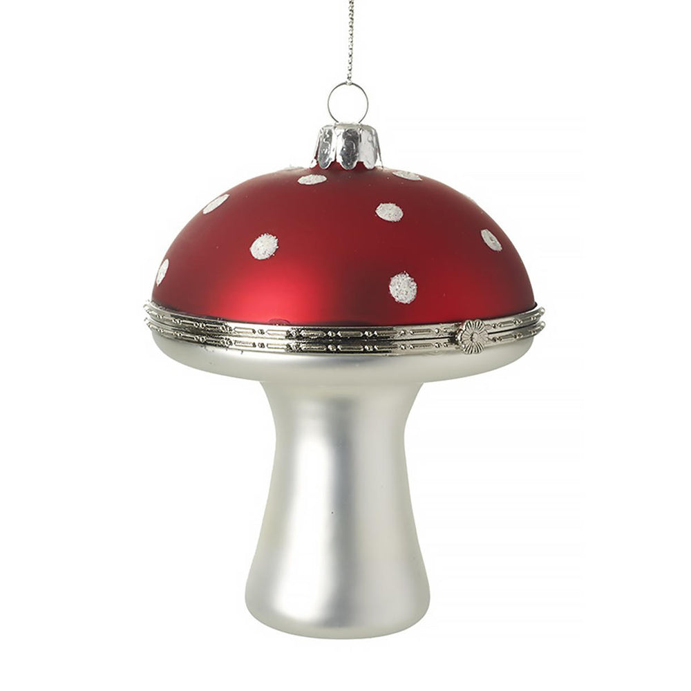 Hinged toadstool tree decoration glass bauble with a silver coloured snap close fitting.