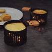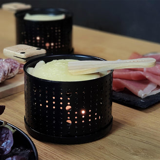 Simply melt Swiss cheese in the raclette pans over a standard tea-light, and within three minutes you can enjoy a delicious raclette.