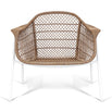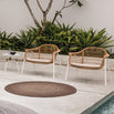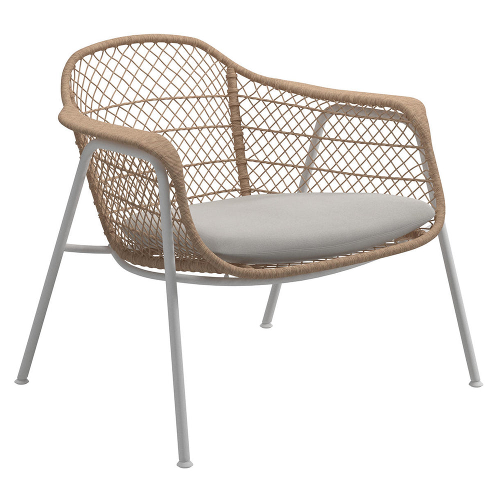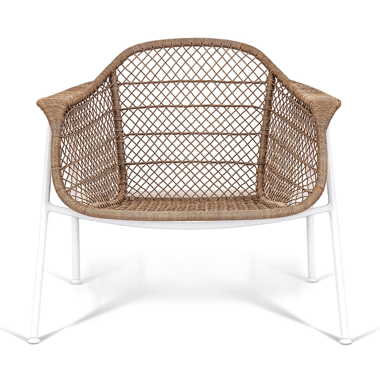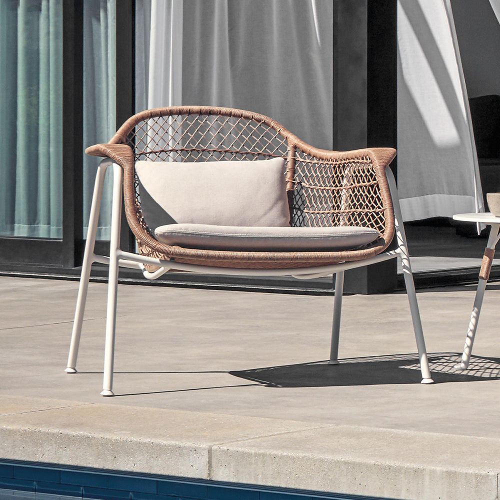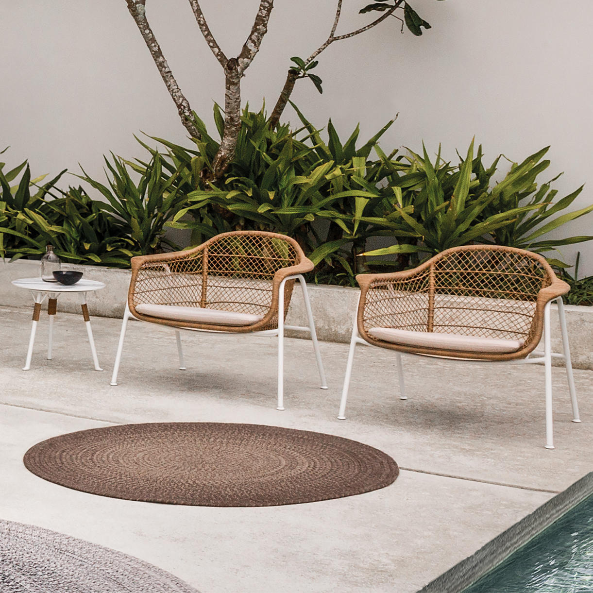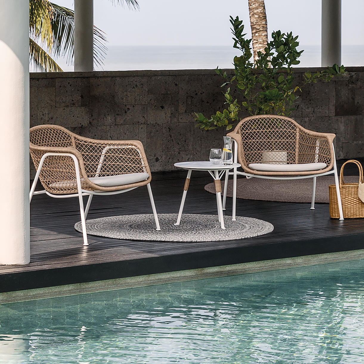 The Lounge chair is an aluminium frame with an all-weather wicker weave. The seat cushion is available in a choice of fabrics.