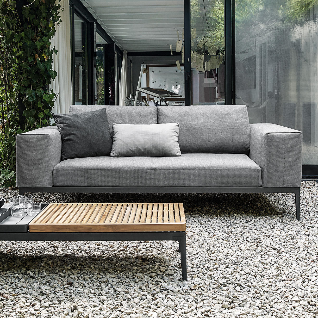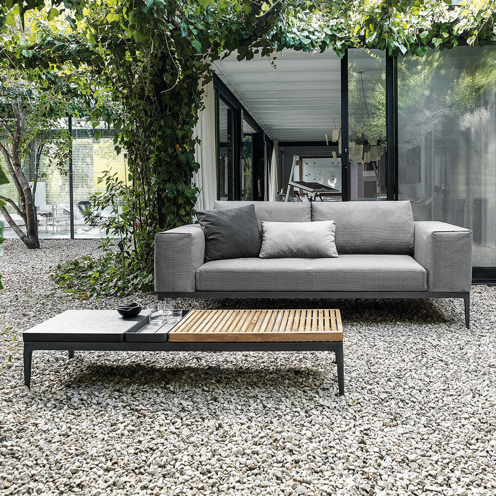 Powder coated aluminium base frames are teamed with comfortable seat and back cushions making Grid by Gloster a versatile, modular outdoor lounge collection.
