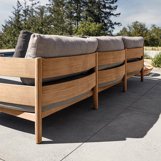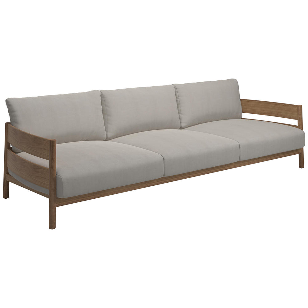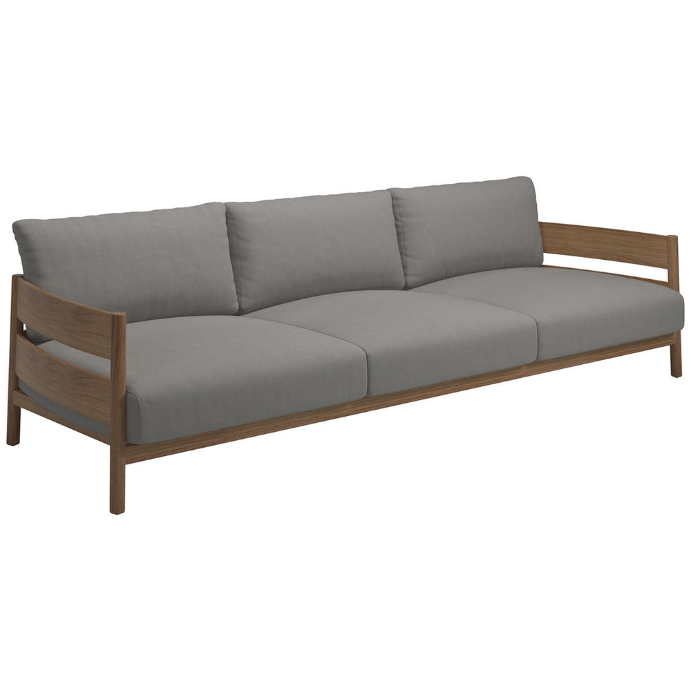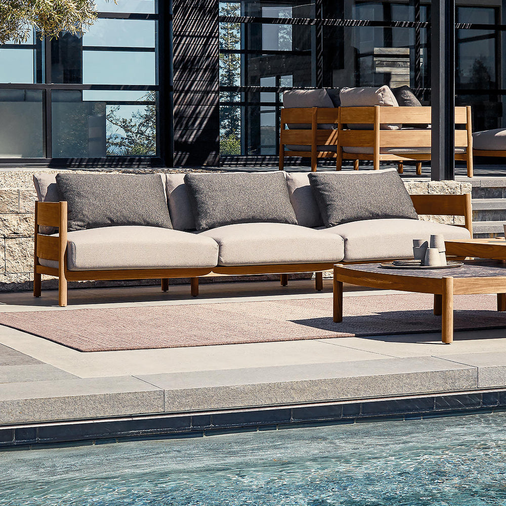 The Haven 3 seater sofa is part of the Haven outdoor lounge collection by Gloster. Haven has been designed with a nod to the nautical. The collection combines solid teak frames with deep and luxurious seat cushions and back cushions. The teak is subtle and organic with a soft warmth. The rounded back and side panels are designed to give an enveloping feeling thus creating a warm and welcoming environment in which to relax.