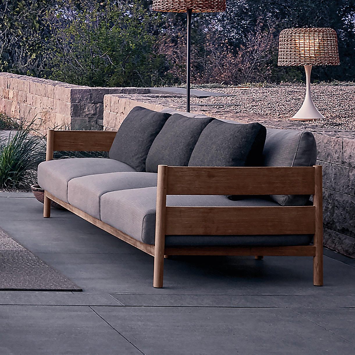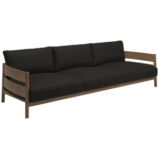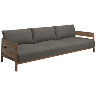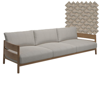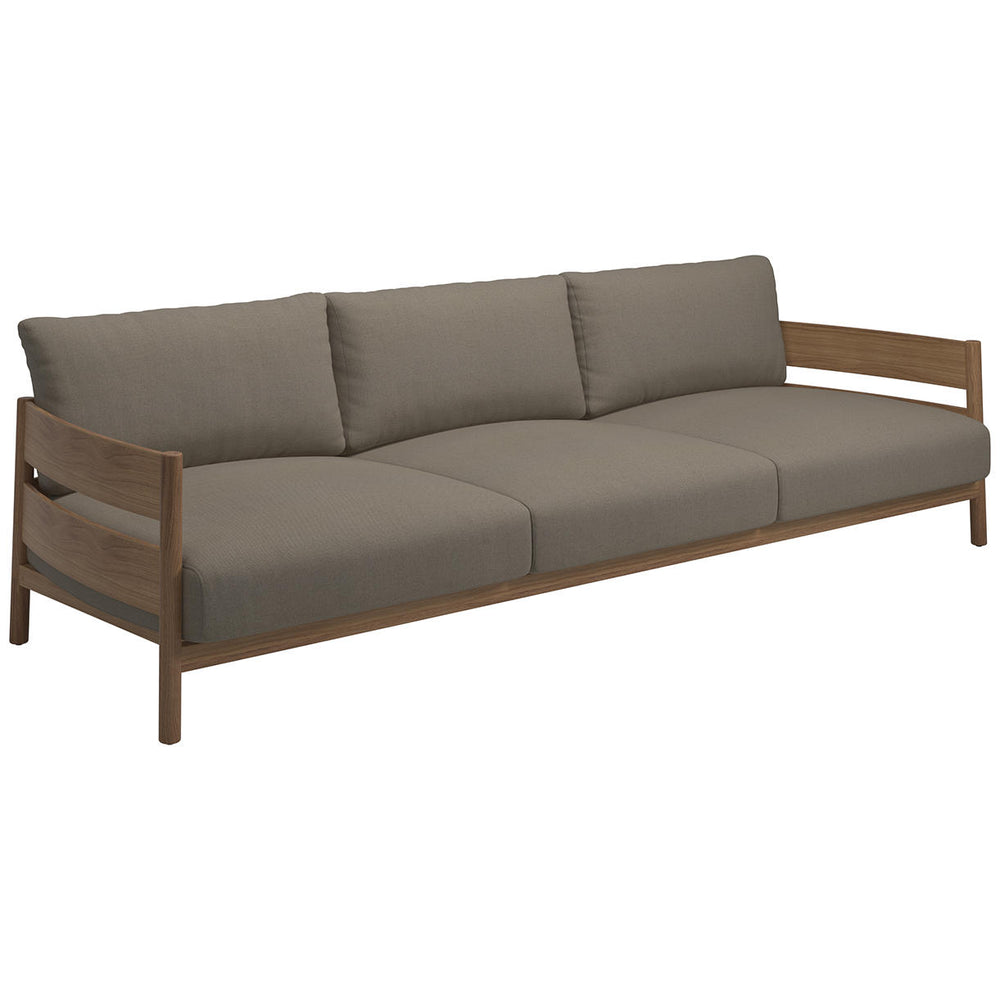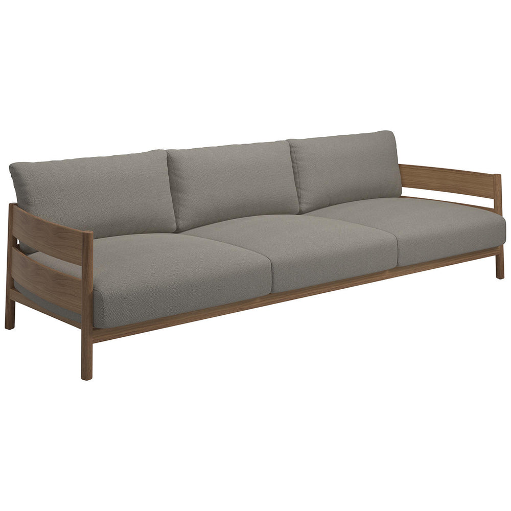 The Haven 3 seater sofa is part of the Haven outdoor lounge collection by Gloster. Haven has been designed with a nod to the nautical. The collection combines solid teak frames with deep and luxurious seat cushions and back cushions. The teak is subtle and organic with a soft warmth. The rounded back and side panels are designed to give an enveloping feeling thus creating a warm and welcoming environment in which to relax.