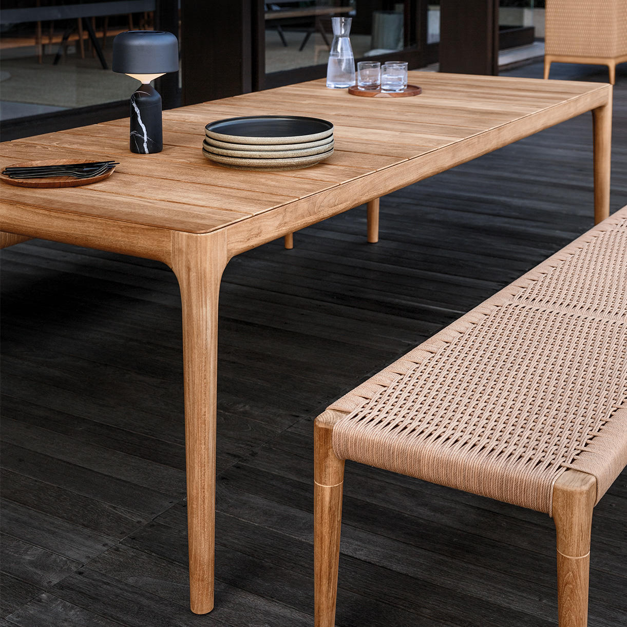 Lima by Gloster epitomizes the fusion of natural and tactile elements into a singular expression of refinement. Crafted from premium-grade plantation teak, the Lima dining table features a solid construction with a slatted teak top, offering seating for either 6 or 8 people.