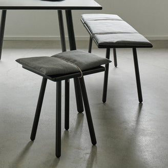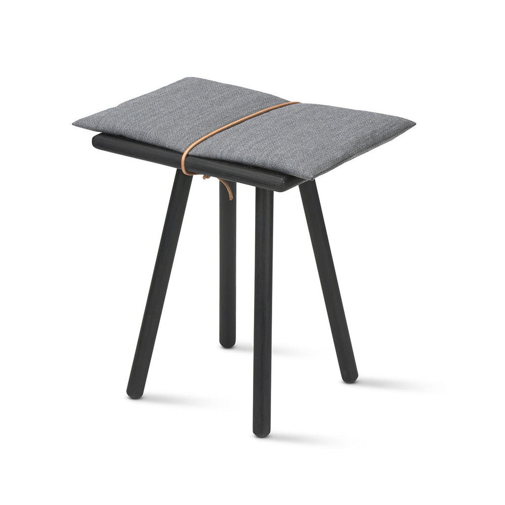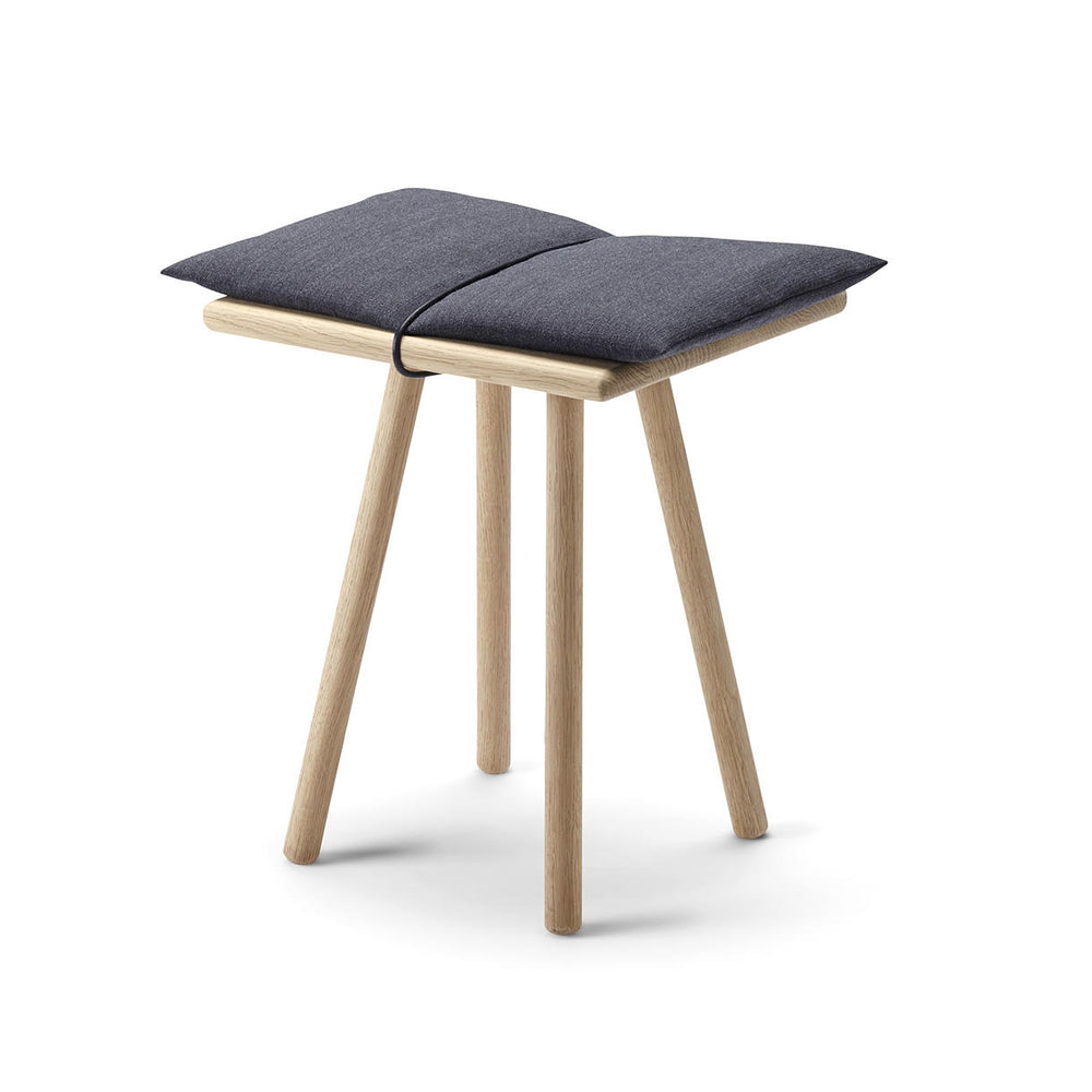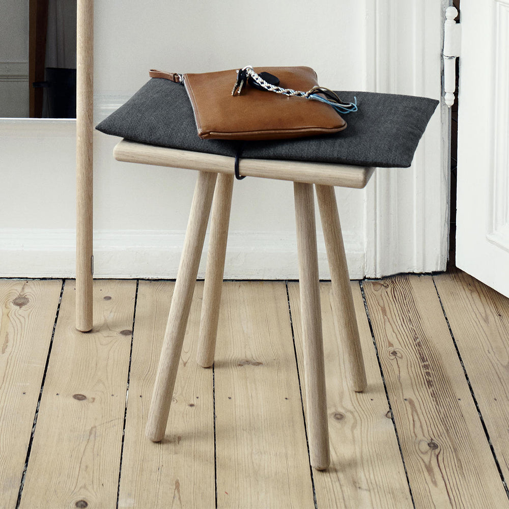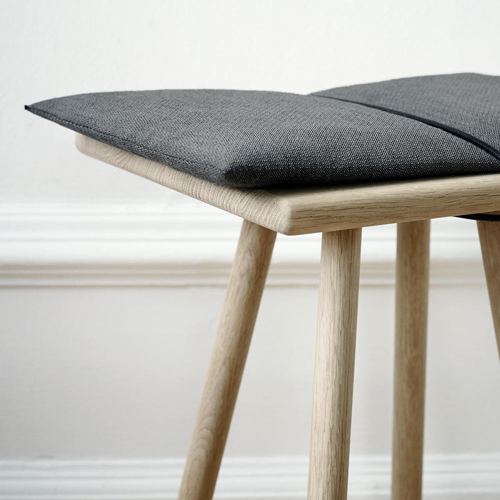 A soft woollen cushion sits atop the beautifully finished oak seat for an extra layer of comfort, fastened and held together with a leather strap - a black strap on the Oak stool, and a natural strap on the Black stool.