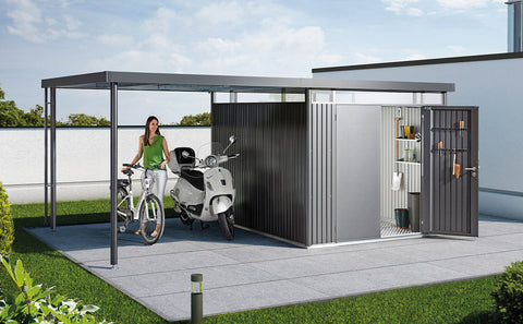 A larger set up for a larger space. This idea shows a set of tool hangers, support rails and two shelves as shown above. These accessories come with the HighLine shed as standard. The side canopy acts as a shelter for larger items of vehicles are are not stored in the shed. Check out further accessories and installation below, where you can customise your HighLine even further.