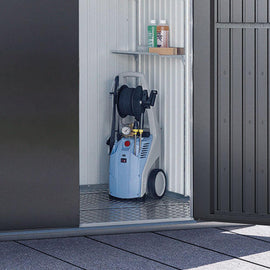 A 3-way locking mechanism ensures that all your tools and equipment are stored away securely. The roof is fitted with an integrated gutter, with a connection for a hose. The gutter has leaf traps fitted to both sides for easy maintenance.The HighLine comes with a set of tool hangers, a set of two tool holders and a set of two 24.5cm deep shelves with supports rails.